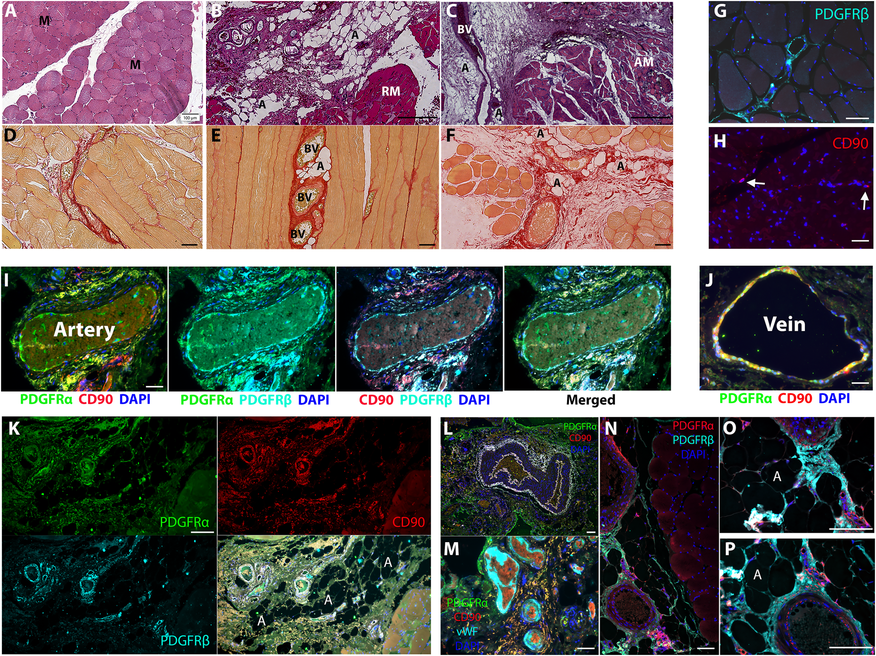 PDGFRβ+PDGFRα+CD90+ cells contribute to fibro-adipogenic lesion formation in diseased human muscle. (A–C) H&E staining of healthy (A) and diseased [(B), moderate and (C), severe] human muscle sections. Healthy myofibers (M) are replaced by adipose tissue (A) and fibrotic scars (F) that surround large blood vessels (BV) in muscle perimysium. Regenerating myofibers [(B), RM] are substituted by smaller and amorphous atrophied myofibers [(C), AM] with disease progression. (D–F) Picrosirius red staining for type I and type III collagen in healthy (D) early stage (E) and severe (F) disease stage. Small adipose tissue lesions are detected adjacent to collagenous blood vessels at early stage (E) and occupy larger areas close to fibrotic scars [(F), red] at severe stage. (G–P) Representative images of healthy (G–J) and diseased (K–P) human muscle sections, immunolabeled for detection of PDGFRβ, PDGFRα and CD90 as indicated. Blue nuclear staining for DAPI. In healthy muscles the indicated markers are expressed by perivascular of arteries and veins (G, I, J) and interstitial cells [(G, H), arrows]. PDGFRβ+PDGFRα+CD90+ cells occupy large fibrotic scars in interstitial spaces (K) and around large blood vessels (I) and form small lesions near arteries and veins in diseased muscles (M–P). Blood vessel luminal endothelial cells were identified by the expression of von Willebrand factor and are seen surrounded by PDGFRα+CD90+ perivascular and scar residing cells (M). Scale bars represent 100 μm.