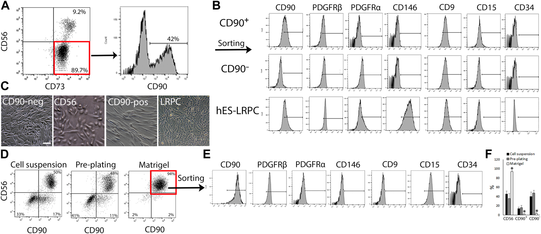 Identification and isolation of primary cell subsets from human muscles. (A) Representative flow cytometry analyses of CD73, CD56 and CD90 expression by primary human muscle cells cultured in EGM-2 medium at passage 0 (n = 8 donors). (B) Representative flow cytometry analysis of expression of characteristic cell surface markers: CD90, PDGFR-β, and CD146 (perivascular cells); CD9 (adipogenic progenitors), CD15 (myoblasts) and CD34 (endothelial, hematopoietic progenitors and adventitial cells) by either expanded human muscle cell sorted subsets (CD90+ and CD90−) or lineage restricted, perivascular-like cells (LRPC) that were derived from hES. Cells were analyzed between passages 1 and 5. (C) Representative images of cultured human muscle subsets and hES-LRPC. (D) Representative dot plots of tested conditions for human muscle myoblast enrichment and sorting strategy of myoblasts based on the expression of CD56 and CD90. Nearly all muscle cells were myoblasts when expanded in Matrigel coated dishes and EGM-2 medium at passage 0 (right panel). (E) Flow cytometry analysis of co-expression of perivascular markers, CD90, PDGFRβ and CD146 as well as the myoblast marker CD15 by sorted CD56+CD90+ human muscle-derived myoblasts between passages 1–3. (F) Frequency of CD56+, CD90+ and CD90− subsets, harvested from uncoated culture dishes (cell suspension and pre-plating) or Matrigel coated dishes between passages 0 and 1. Data are mean ± SD, n = at least 3 donors per cell subset. Data analyzed via one-way ANOVA. *p < 0.001 between frequency of cell subset that was cultured on Matrigel, and the matched cell subset in cell suspension and pre-plating culture conditions. Scale bar represents 100 μm.