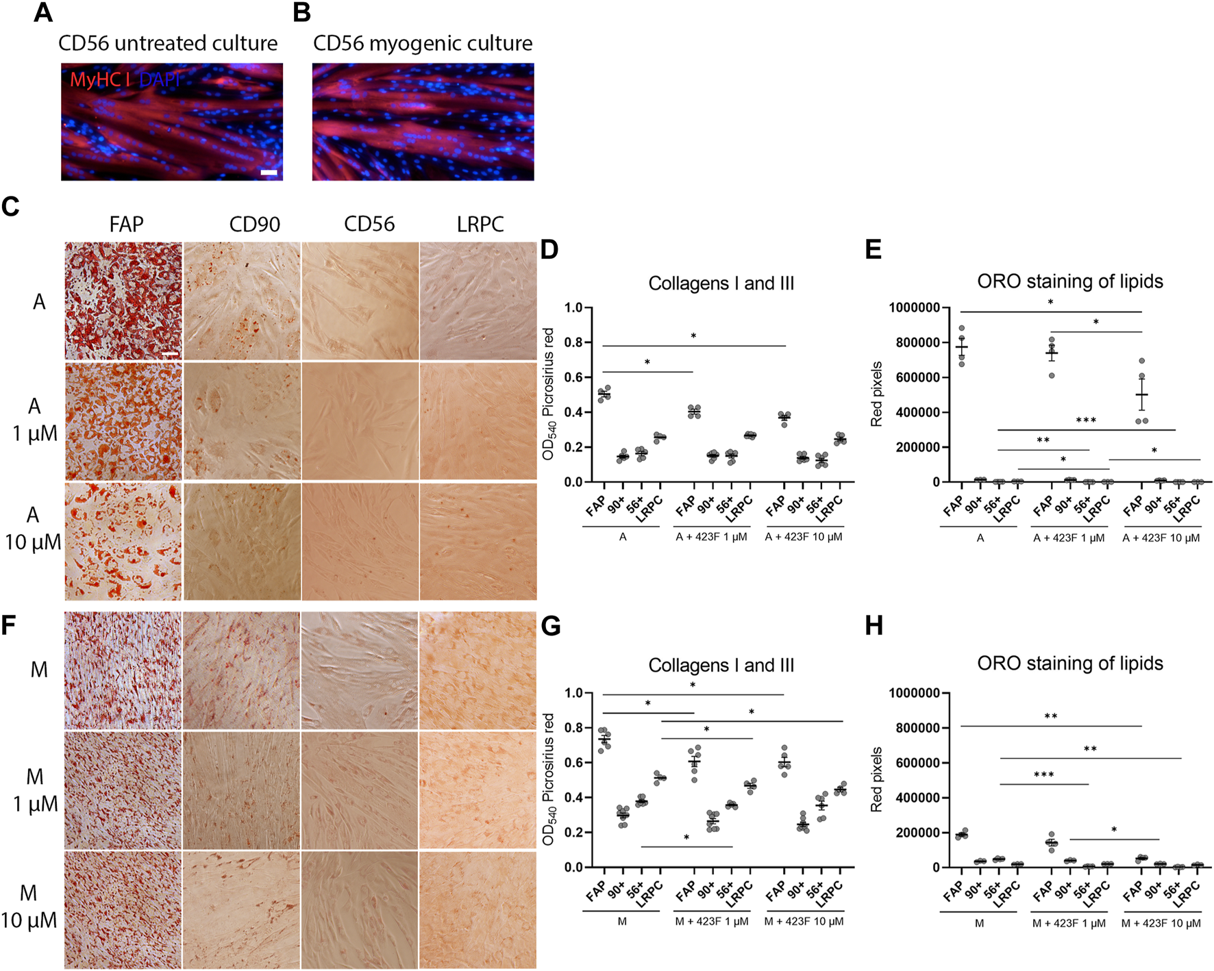 423F elicits greater inhibition of human muscle FAP fibro-adipogenic differentiation than that of CD56, CD90, and LRPC in adipogenic and myogenic cultures. (A–B) Myogenic differentiation is detected only in CD56 subset as seen in representative images of DAPI and Myosin heavy Chain I (MyHC I)-stained syncytial cells from CD56 in untreated culture (A) and myogenic serum-induced culture (B). Representative images of Oil Red O-stained adipogenic cells in adipogenic (C) and myogenic cultures (F) for each cell subset. Picrosirius red spectrophotometric quantification of collagen production (D, G) and red pixel quantification of Oil red O-stained adipocytes (E, H) at the indicated conditions in the presence or absence of 1 uM and 10 µM 423F. Data (mean ± SEM) was pooled from multiple experiments with triplicates for all cultures (n = at least 3 per cell subset). Data was analyzed via paired one-way ANOVA and Tukey’s post hoc multiple comparisons. ***p < 0.001, **p < 0.01, *p < 0.05. Scale bar represents 100 μm.