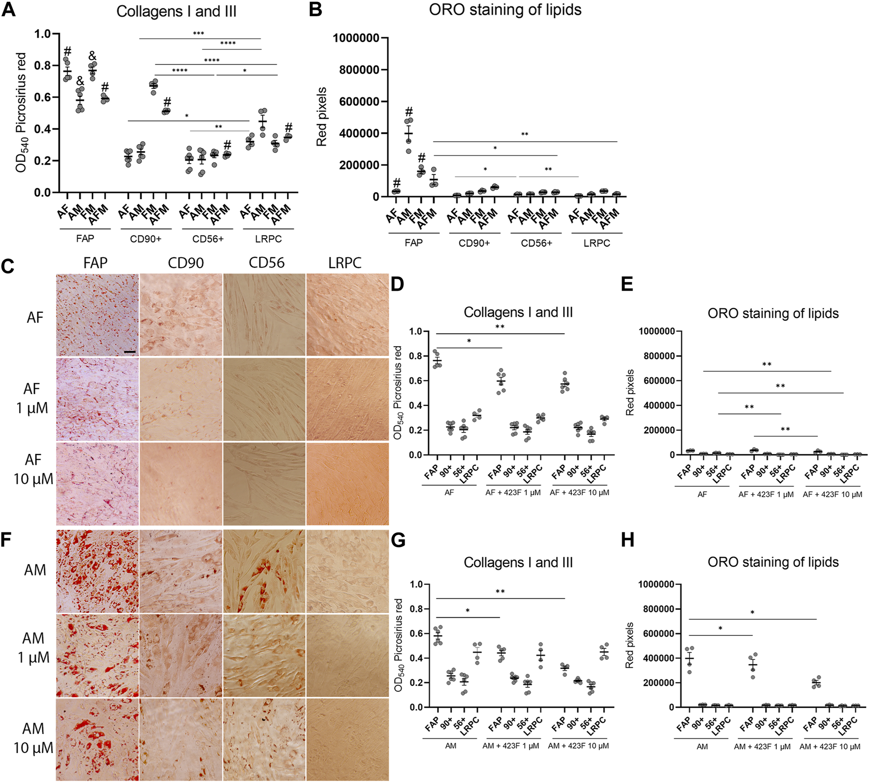 423F elicits greater inhibition of human muscle FAP fibro-adipogenic differentiation than that of CD56, CD90, and LRPC in adipo-fibrogenic and adipo-myogenic cultures. Picrosirius red spectrophotometric quantification of collagen production (A, D, G) and red pixel quantification of Oil red O-stained adipocytes (B, E, H) at the indicated conditions (AF = adipo-fibrogenic, AM = adipo-myogenic, FM = fibro-myogenic, AFM = adipo-fibro-myogenic) in the presence or absence of 1 and 10 µM 423F. Data (mean ± SEM) was pooled from multiple experiments with triplicates for all cultures (n = at least 3 per cell subset). Representative images of Oil Red O-stained adipogenic cells in adipo-fibrogenic (C) and adipo-myogenic (F) cultures for each cell subset. Data was analyzed via paired one-way ANOVA for comparisons between the same cell subset and unpaired one-way ANOVA for comparisons between different cell subsets, followed by Tukey’s post hoc multiple comparisons. # denotes significance between FAP and all other cell subsets in the AF condition, as well as significance between comparisons of all cell subsets in the AFM condition. & denotes significance between FAP and all other subsets in AM and FM conditions. #p < 0.0001, &p < 0.05, ****p < 0.0001, ***p < 0.001, **p < 0.01, *p < 0.05. Scale bar represents 100 μm.