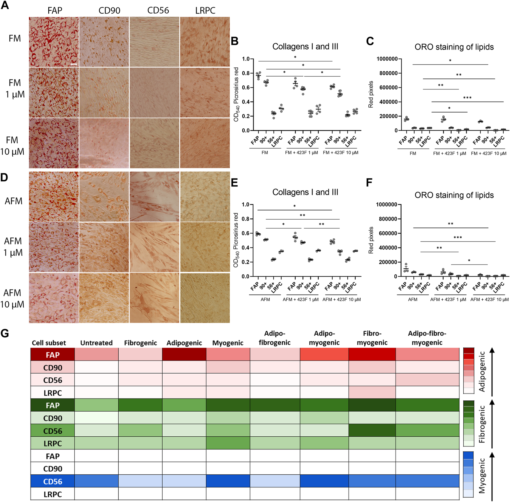 423F elicits greater inhibition of human muscle FAP fibro-adipogenic differentiation than that of CD56, CD90 and LRPC in fibro-myogenic and adipo-fibro-myogenic cultures. Representative images of Oil Red O-stained adipogenic cells in fibro-myogenic (A) and adipo-fibro-myogenic cultures (B) for each cell subset. Picrosirius red spectrophotometric quantification of collagen production (B, E) and red pixel quantification of Oil red O-stained adipocytes (C, F) at the indicated conditions in the presence or absence of 1 and 10 µM 423F. Data (mean ± SEM) was pooled from multiple experiments with triplicates for all cultures (n = at least 3 per cell subset). Data was analyzed via paired one-way ANOVA and Tukey’s post hoc multiple comparisons, ***p < 0.001, **p < 0.01, *p < 0.05. (G) Color scale denotes the degree of subset differentiation. Scale bar represents 100 μm.