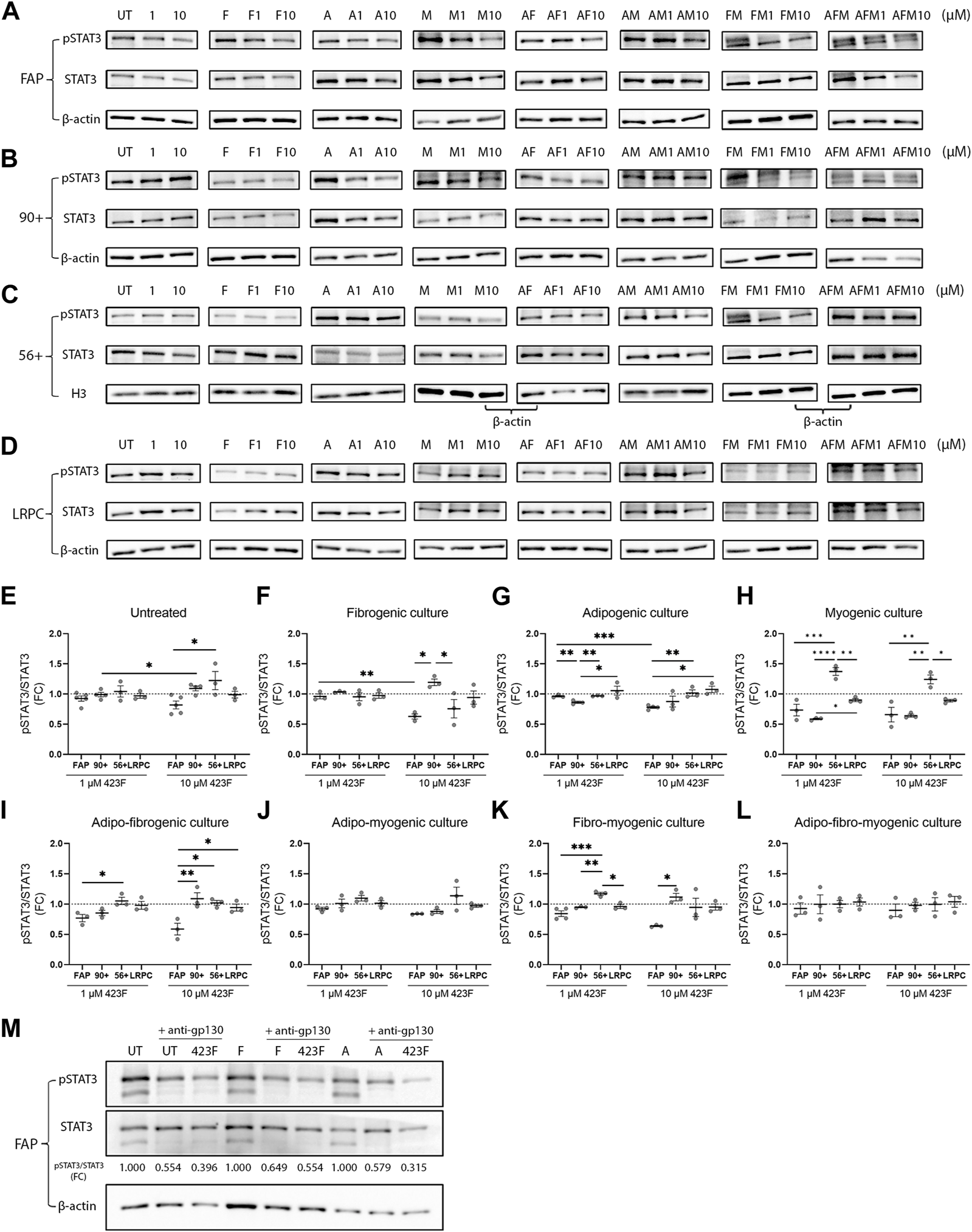 423F-mediated modulation of STAT3 expression and activity in cultures of human muscle cell subsets. (A–D) Representative images of western blot analyses of pSTAT3 and STAT3 from FAP (A), CD90 (B), CD56 (C), and LRPC (D) whole-cell lysates harvested after 24-h in the indicated culture conditions. (E–L) Levels of pSTAT3 were related to total-STAT3 levels for each cell subset at the indicated conditions. Data (mean ± SEM) was pooled from multiple experiments and presented as fold change (FC) between indicated conditions not treated with 423F and indicated conditions treated with 1 μM and 10 µM 423F (n = at least 3 per cell subset, except for LRPC that were derived from a single cell source). Data was analyzed via paired one-way ANOVA for comparisons between the same cell subset and unpaired one-way ANOVA for comparisons between different cell subsets, followed by Tukey’s post hoc multiple comparisons. ***p < 0.001, **p < 0.01, *p < 0.05. (M) Representative images of western blots of pSTAT3 and STAT3 of control, 423F, and 423F and anti-gp130-treated FAP in untreated (UT), fibrogenic (F), and adipogenic (A) cultures.