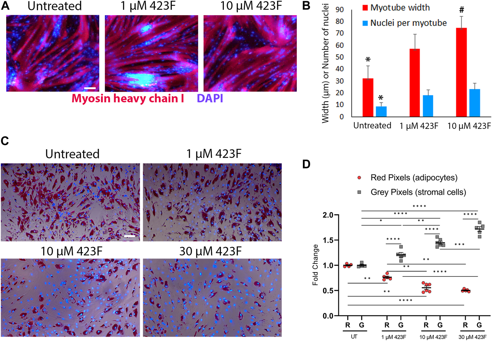 Different effects of 423F treatment on differentiated muscle progenitor derivatives. (A, B) Analysis of MyHC I+ myotube maturation based on myotube diameter and number of nuclei per myotube as seen in representative images of untreated and 423F treated cultures of CD56+CD90+ progenitors (A) and matched measurements (B). Graphs represent mean ± SEM. n = at least 3 donors. Data analyzed via one-way ANOVA. *p < 0.001 between 423F treated cultures and untreated control cultures, #p < 0.0000001 between 1 µM treated cultures and 10 µM treated cultures. (C, D) Survival of human muscle-derived mature adipocytes (Oil red O+DAPI+ cells) and FAP (gray DAPI+ cells) in mixed cultures in the absence or presence of increasing concentrations of 423F. Blue nuclear staining for DAPI and Oil red O staining for adipocytic lipid droplets (C). Percentage of red pixels (adipocytes) and gray pixels (FAP) out of total area of images of 423F treated cultures (D). Data was analyzed via paired one-way ANOVA for comparisons between 423F concentrations between the same cell and unpaired Student’s t test for comparisons between adipocytes and stromal cells, followed by Tukey’s post hoc multiple comparisons. ****p < 0.0001, ***p < 0.001, **p < 0.01, *p < 0.05. Scale bars represent 100 μm.