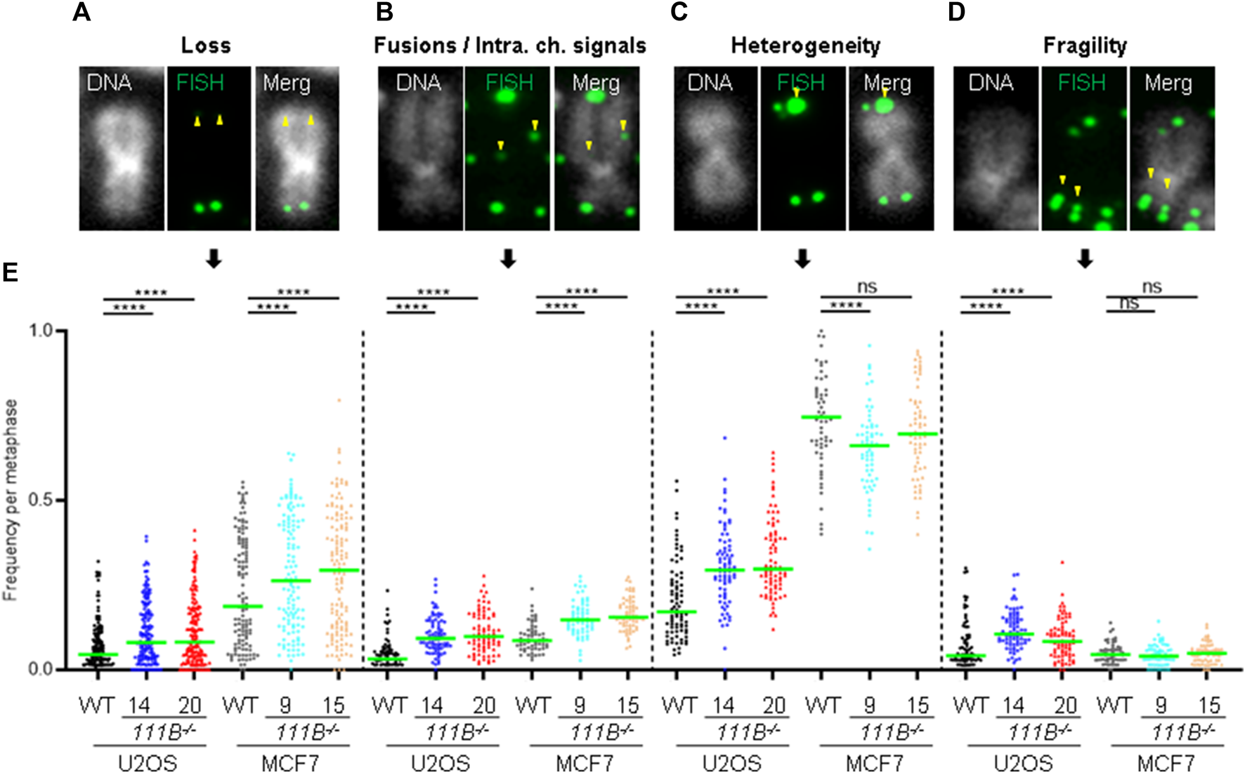 Loss of FAM111B induces telomere abnormalities. (A–D) Widefield images of individual chromosomes stained with a fluorescent probe against telomeric repeats, showing telomeric abnormalities detected in FAM111B-deficient cells. These include telomere loss, fusions/intrachromosomal telomere signals, heterogeneity and fragility. (E) Quantification of telomeric phenotypes in U2OS and MCF7 wild-type (WT) and FAM111B−/- cells per metaphase. Green bars show averages of N = 3 experiments, with at least 30 metaphase spreads scored per sample in each experiment. Only MCF7 telomer heterogeneity data was analyzed with OWA test, rest of the datasets were analyzed with K-W test.