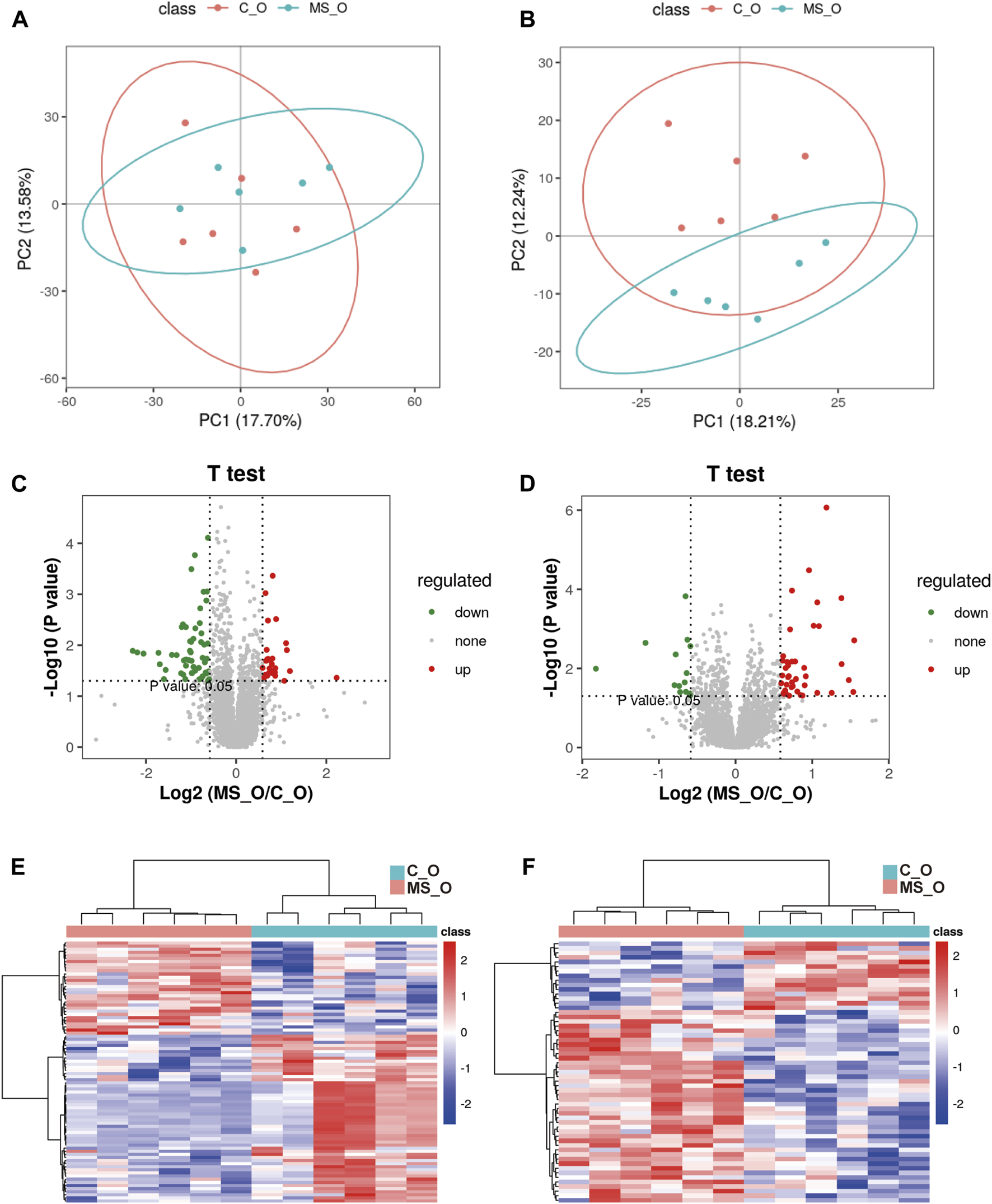 Krill oil supplement ameliorating CUMS-induced lipid metabolism imbalance in mice. (A,B) PLS-DA score plots of samples prepared from C_O and MS_O mice under positive (A) and negative modes (B). (C,D) Volcano plot analysis of the differential metabolites in C_O mice compared to MS_O mice under positive (C) and negative modes (D). (E,F) Heatmap of the level of differential metabolites in C_O mice compared to MS_O mice under positive (E) and negative modes (F).