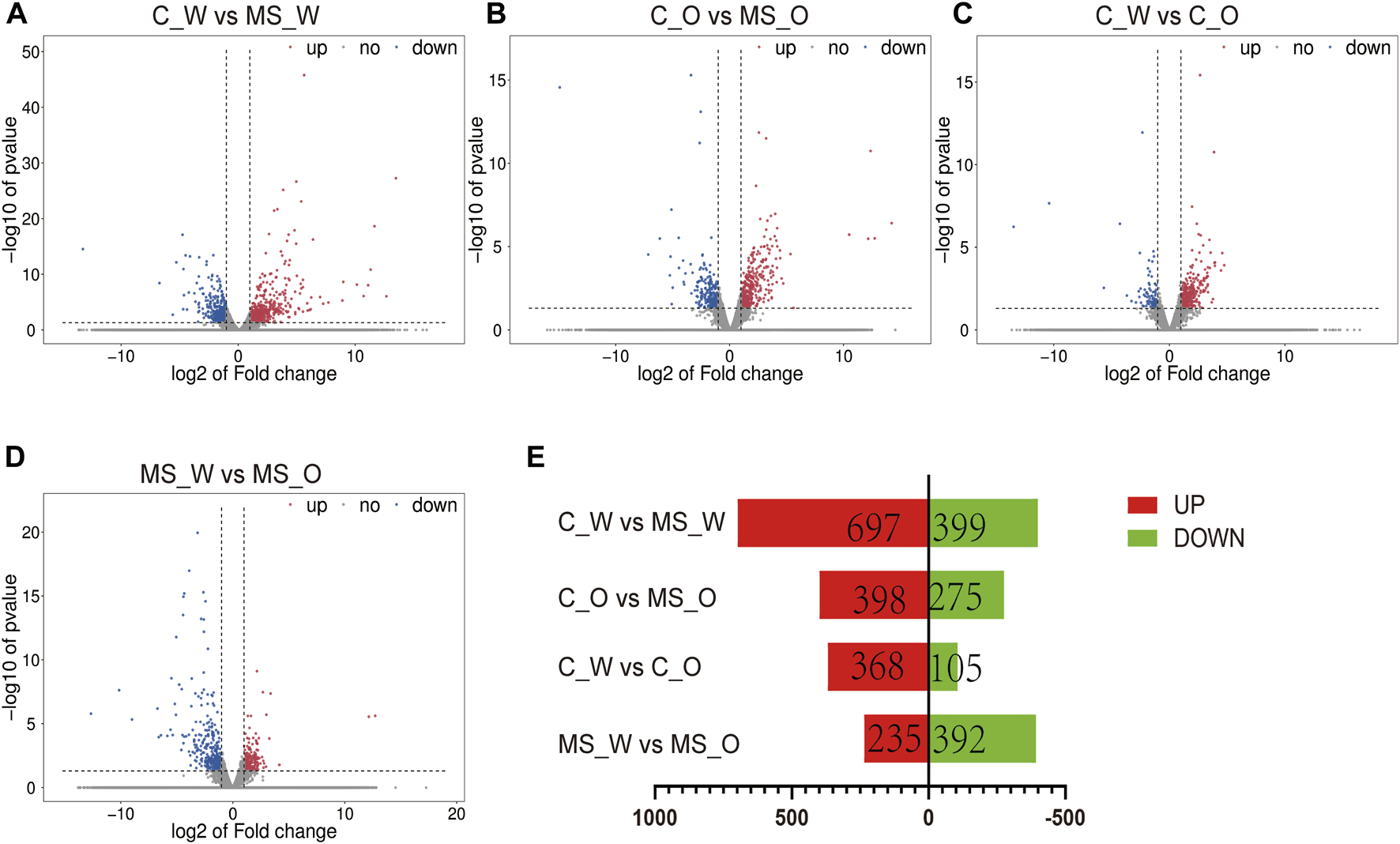 Although changes in lipid metabolism have been reported in some regions of the rat brain (Oliveira et al., 2016), the investigation of lipid metabolism in the whole brain is lacking. Here, we isolated the whole brain of mice in the C_W, C_O, MS_W, and MS_O groups after CUMS treatment, and analyzed the lipid metabolome using high-performance LC-MS (Supplementary Table S9). The pattern discriminant analysis of relevant data was carried out by partial least squares discriminant analysis (PLS-DA). As shown in Figures 2A, B, compared to the samples in the C_W group, samples in the MS_W group in both positive and negative modes were clustered tightly according to the PLS-DA scores, which indicated that significant alterations of endogenous metabolites were caused by CUMS treatment. As shown in Figure 2C, compared to the C_W group, 229 differential metabolites were observed in the MS_W group under the positive mode, of which 72 metabolites were upregulated and 157 metabolites were downregulated. In addition, there were 62 upregulated metabolites and 70 downregulated metabolites in the MS_W group under the negative mode when compared with the C_W group (Figure 2D). Furthermore, the volcano plot analysis of the differential metabolites in C_W mice compared to MS_W mice under the positive and negative modes also found that differential metabolites under the positive mode were mainly rich in fatty acyls, glycerolipids, glycerophospholipids, and sphingolipids, as well as glycerophospholipids and sphingolipids under the negative mode (Figures 2E, F). These results suggested that lipid composition was altered after CUMS treatment in mice.