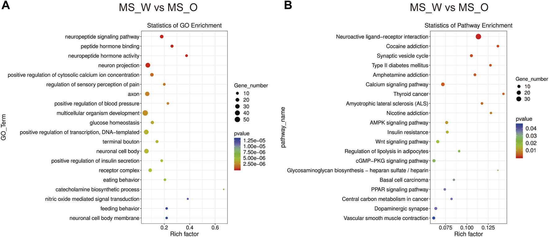 To further investigate the lipid metabolism difference between water and oil after CUMS treatment, the lipid metabolism of the whole brain in the MS_W and MS_O groups was analyzed (Supplementary Table S11). As shown in Table 4, three differential metabolites, namely, GlcCer [NS] 42:2 [GlcCer [NS](d18:1/24:1)], PC 40:2 [PC(18:1/22:1)], and LysoPE 20:1, were identified. Comparing to the samples in the MS_W group, the levels of GlcCer [NS] 42:2 and LysoPE 20:1 significantly increased in the MS_W group and the level of PC 40:2 decreased.