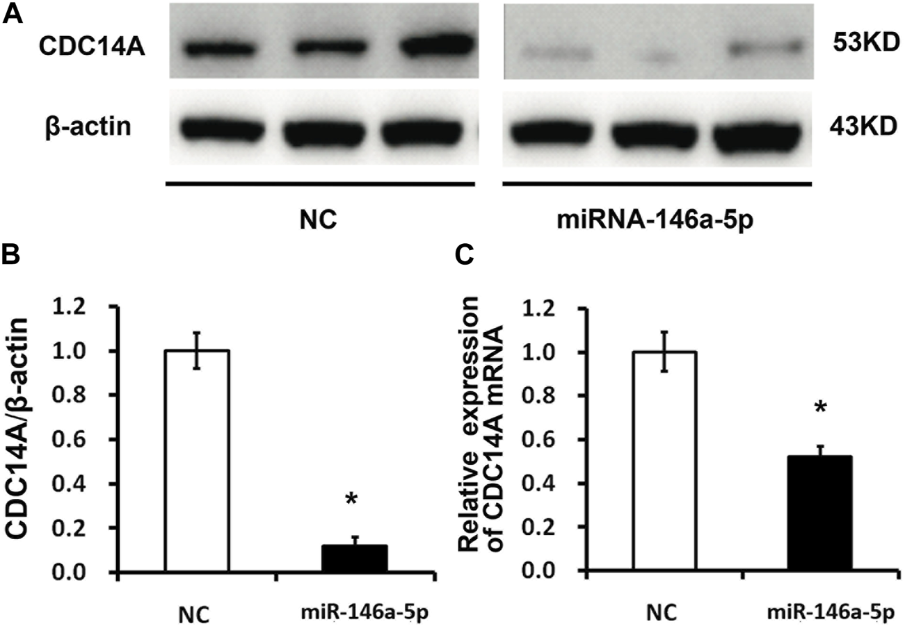 In contrast to the NC group, mRNA levels of CDC14A identified by qRT-PCR declined in the miRNA-146a-5p mimic-transfected group (p < 0.05) (Figure 5C). Consistently, WB experiments on CDC14A protein levels exhibited remarkably reduced CDC14A levels in the miRNA-146a-5p mimic group compared with those in the NC group (p < 0.05) (Figures 5A, B).