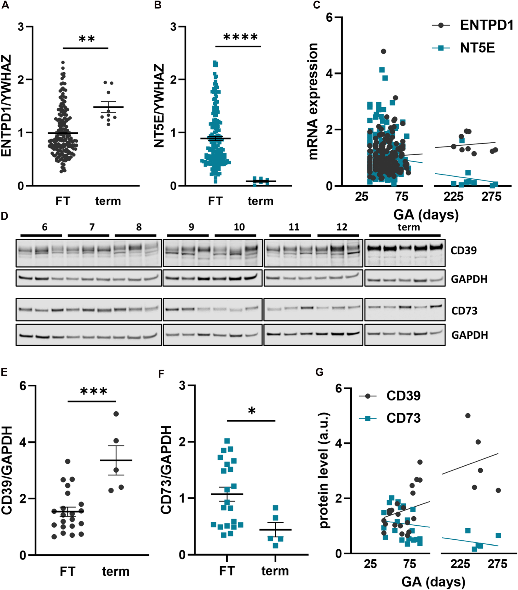 Placental CD39 and CD73 expression over human gestation. Expression of CD39, encoded by ENTPD1, and CD73, encoded by NT5E, was analyzed in first trimester (FT) as well as third trimester (term) placental tissue on mRNA (A–C) and protein level (D–G). CD39 is increasing towards term on gene expression (FT n = 186, mean gestational week 7.72 ± 1.7 vs. term n = 9, mean gestational week 35.48 ± 2.64) (A, C) and on protein level (FT n = 21, mean gestational week 9.27 ± 2.15 vs. term n = 5, mean gestational week 35.89 ± 2.18) (D, E, G). Gene expression (B, C) and protein levels (D, F, G) of CD73 are decreasing at term of pregnancy. Immunoblotting for placental CD39 and CD73 (D). Band density of CD39 and CD73 was normalized to GAPDH. YWHAZ was used as reference gene. Data are presented as mean ± SEM. *p ≤ 0.05, **p ≤ 0.01, ***p ≤ 0.0002, ****p ≤ 0.0001.