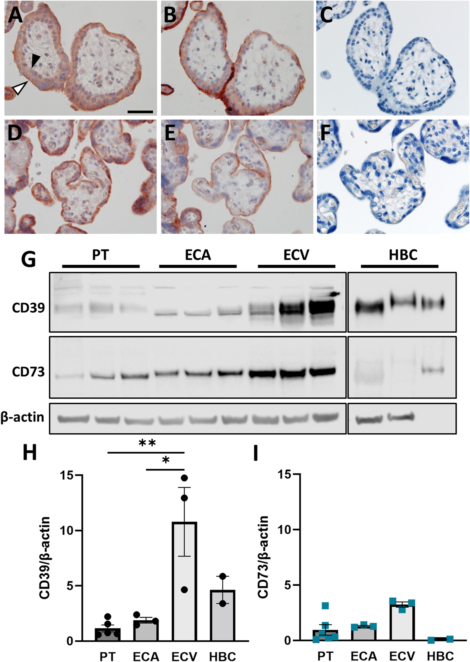 CD39 and CD73 are expressed in key placental cell types. Serial sections of human first trimester (A, B, GA 7 + 5) and term (D, E, GA 39 + 0) placental villous tissue were subjected to immunochistochemistry. CD39 staining (A, D) revealed positive signals on cytotrophoblasts (black arrowhead) as well as on the syncytiotrophoblast, with higher intensity towards the apical side (white arrowhead). Positive staining for CD73 (B, E) was only found in the syncytiotrophoblast. Negative control for rabbit immunoglobulin fraction gave no staining on first trimester (C) and term placental tissue (F). Scale bar represents 50 μm. CD39 and CD73 was investigated in primary term trophoblast (PT, n = 6), arterial endothelial cells (ECA, n = 3), venous endothelial cells (ECV, n = 3) and Hofbauer cells (HBC, n = 3) from healthy term pregnancies (G). CD39 and CD73 were detected in all cell types, but predominantly in ECVs. Band densities of CD39 (H) and CD73 (I) were normalized to β-actin. Data are presented as mean ± SEM. *p ≤ 0.05, **p ≤ 0.01.