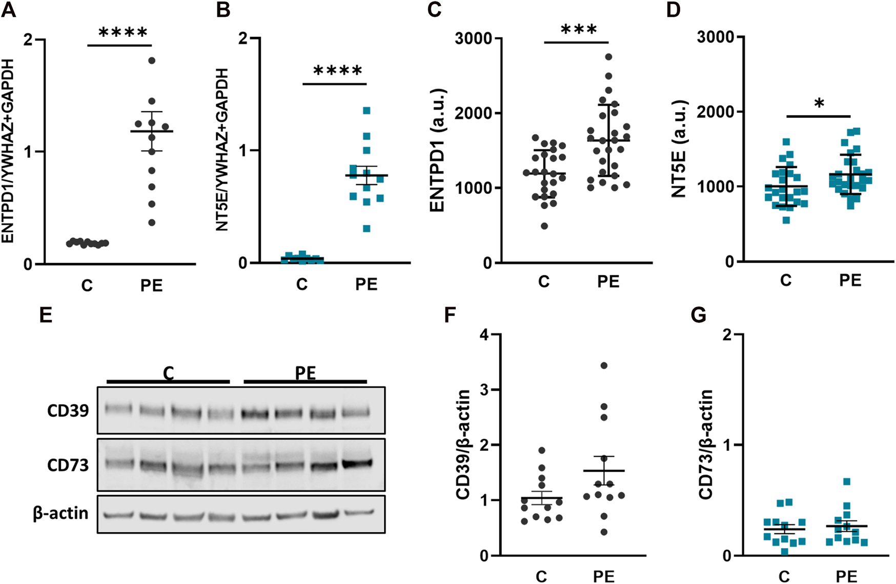 CD39 is upregulated in preeclampsia. Placental villi from healthy (C, n = 12, mean gestational week 38.64 ± 0.56) and preeclamptic (PE, n = 12, mean gestational week 35.34 ± 3.70) patients were subjected either to gene expression (A, B) or immunoblot analyses (E–G). ENTPD1(A) and NT5E(B) were significantly upregulated in preeclamptic cases compared to controls. ENTPD1 and NT5E were also analyzed from a previously published microarray dataset (Herse et al., 2012) in controls (n = 23) and PE (n = 26) cases (C, D). Immunoblot analysis of CD39 (E, F) showed a slight increase in preeclamptic cases, whereas protein analysis of CD73 (E, G) revealed no difference between C and PE. Protein levels were normalized to β-actin. YWHAZ and GAPDH were used as reference genes for gene expression analysis. Data are presented as mean ± SEM. ****p ≤ 0.0001.