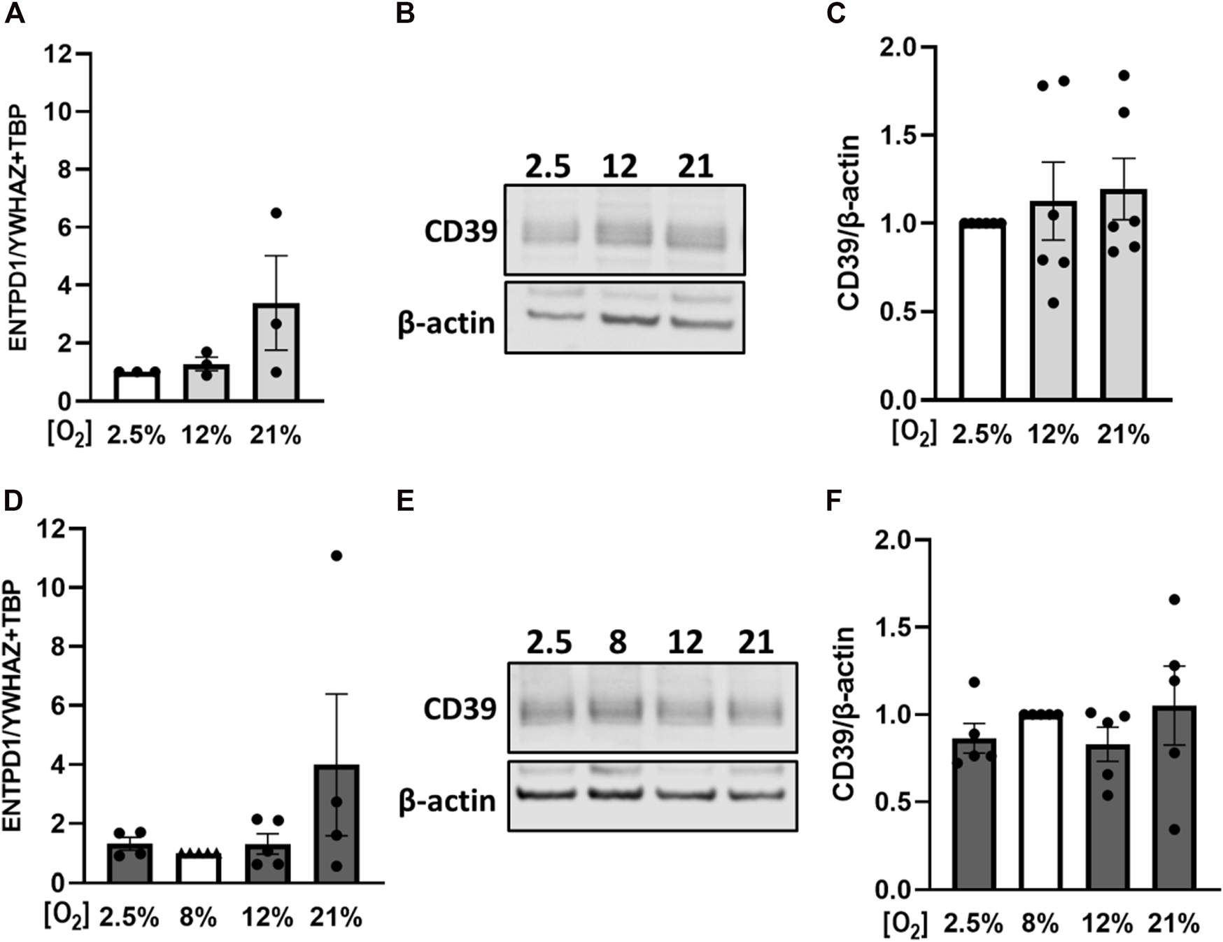 Effect of oxygen on placental CD39 expression. Human first trimester (A–C) and term (D–F) placental explants were incubated for 24 h under indicated oxygen concentrations. Gene expression analysis of ENTPD1 in first trimester tissue (n = 3, mean gestational week 7.48 ± 0.91) revealed a trend towards higher expression upon increasing oxygen concentrations (A). Protein levels of CD39 were analyzed via immunoblot in first trimester tissue (B, C) (n = 6, mean gestational week 7.90 ± 0.78). Healthy term placental explants were analyzed after incubation on mRNA (D) as well as on protein (E, F) level (n = 5, mean gestational week 38.49 ± 0.54). Values from control samples - first trimester (incubated at 2.5% O2, A–C) and term placentas (incubated at 8% O2, D–F)—were set to 1. Band density was normalized to β-actin (B, C, E, F). YWHAZ and TBP served as reference genes for gene expression analysis (A, D). Data are presented as mean ± SEM.