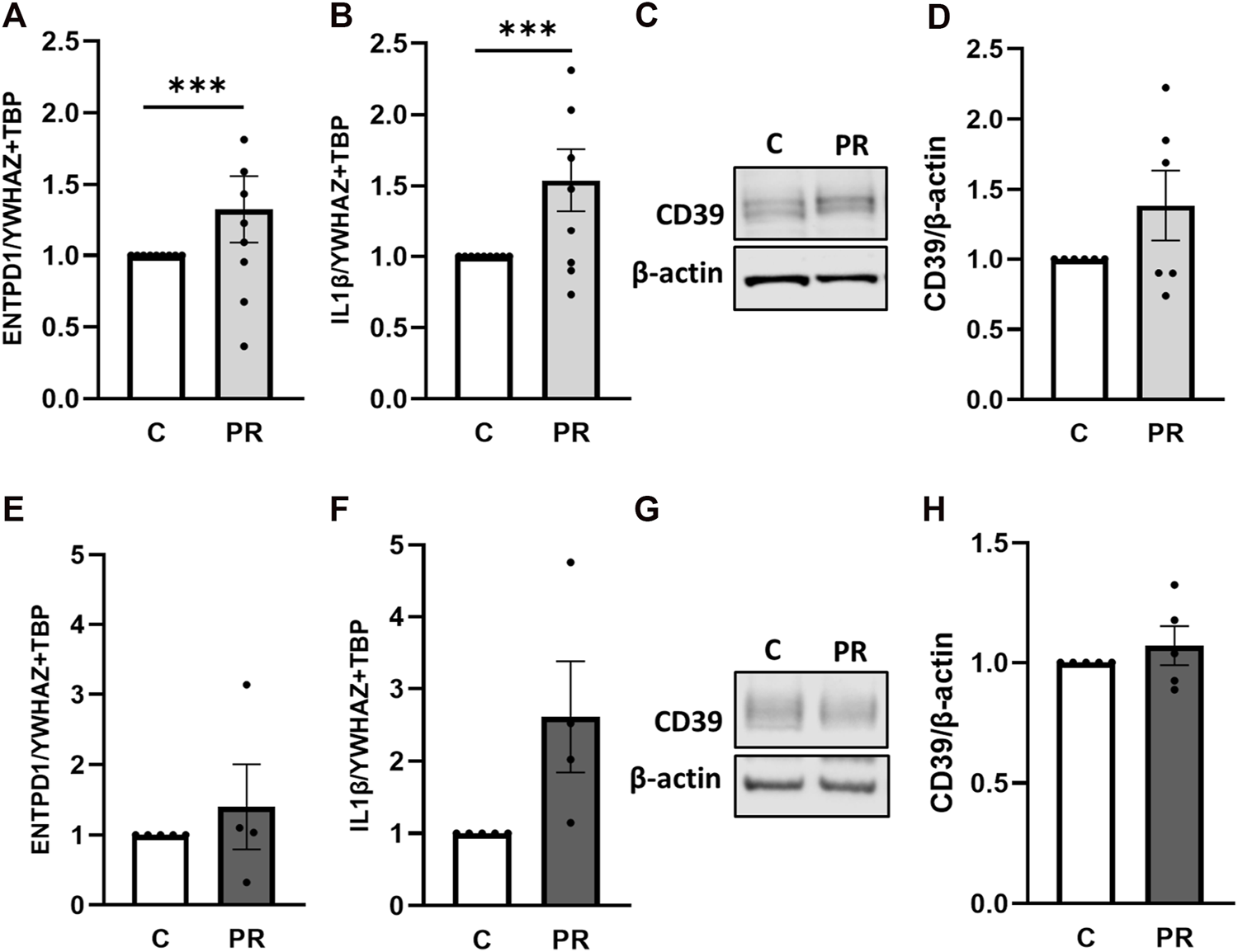 Platelet-derived factors induce placental IL-1β expression. Placental explants from first trimester (A–D) and term (E–H) were incubated for 24 h in presence or absence of a platelet releasate (PR; pool of 10 healthy pregnant women at term). First trimester explants were incubated at 2.5% O2(A–D), whereas placental villi from third trimester were incubated at 8% O2(E–H). After incubation with platelet releasate, placental villi from first trimester (A, B, n = 9; mean gestational week 7.66 ± 0.88) and term (E, F, n = 5; mean gestational week 38.49 ± 0.54) were subjected to gene expression analysis for ENTPD1 and IL-1β. Immunoblot analysis revealed a trend towards higher levels of CD39 upon platelet releasate treatment in early (C, D; n = 6; mean gestational week 7.90 ± 0.78) and late (G, H; n = 5; mean gestational week 38.49 ± 0.54) cases. Band density was normalized to β-actin (C, D, G, H). YWHAZ and TBP served as reference genes for gene expression analysis (A, B, E, F). Data are presented as mean ± SEM. ***p ≤ 0.0002.