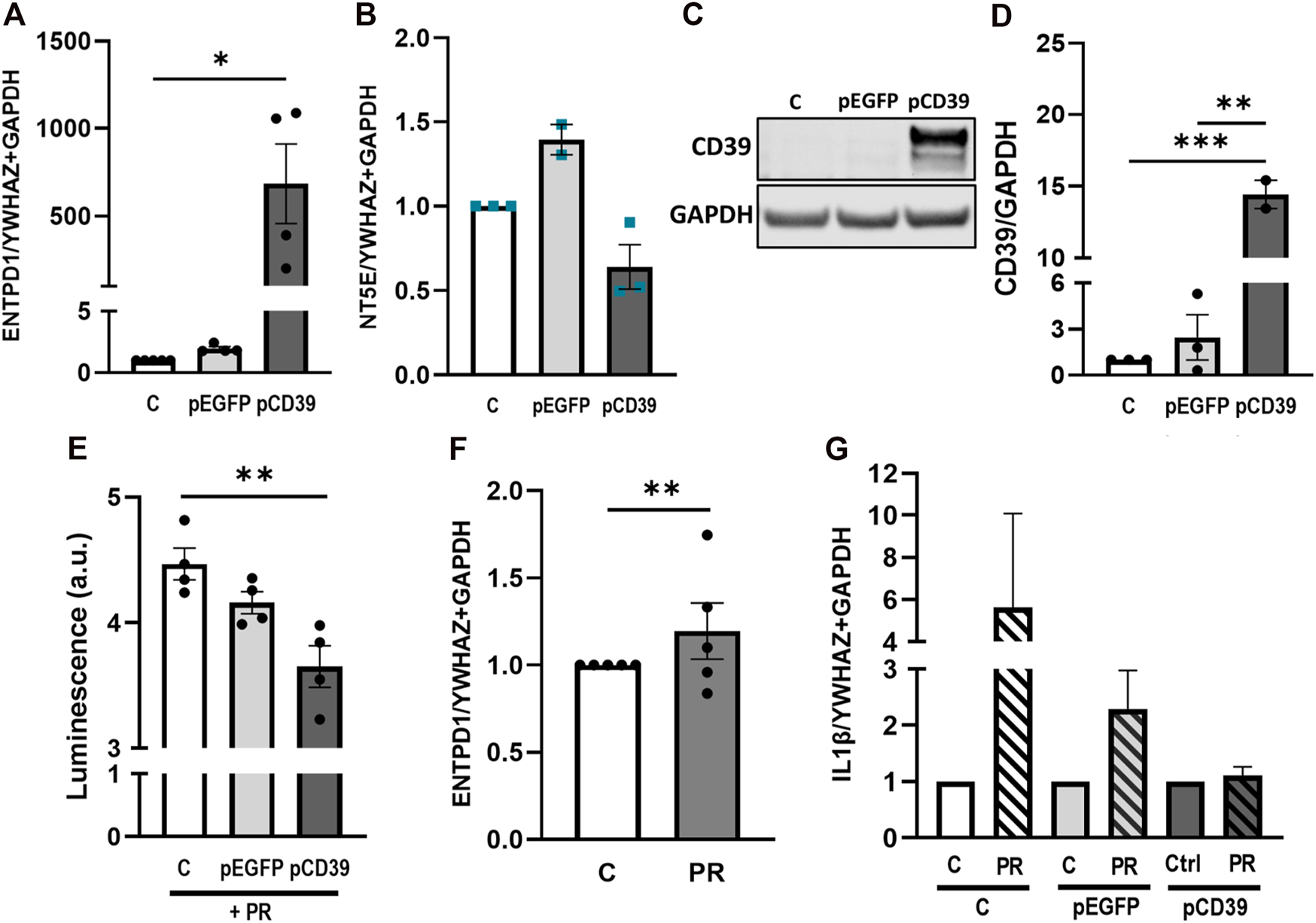 Platelet releasate-induced IL-1β upregulation is abrogated by CD39 overexpression. BeWo cells were transfected with pCD39 or an empty vector for 24 h and were afterwards subjected to qPCR and protein analysis (A–D). Gene expression analysis of ENTPD1 revealed a strong upregulation in pCD39-transfected samples (A). NT5E was not significantly affected by CD39 overexpression (B). Immunoblot analysis confirmed CD39 overexpression in BeWo cells (C, D). Band density was normalized to GAPDH (C, D). Extracellular ATP levels in CD39 overexpressing and control BeWo cell cultures were measured in presence of platelet releasate (PR; pool of 10 healthy pregnant women at term) for 5 h via luminescence measurement (E). BeWo cells were incubated with platelet releasate for 24 h and subsequently subjected to qPCR of endogenous ENTPD1(F). CD39 was overexpressed in BeWo cells for 24 h and cells afterwards incubated in presence or absence of platelet releasate for another 24 h. Cells were subjected to gene expression analysis for IL-1β (G). For gene expression analysis YWHAZ and GAPDH were used as reference genes. Data are presented as means ± SEM from three (B–D), four (E), and five (A, F, G) independent experiments. *p ≤ 0.05, **p ≤ 0.01, ***p ≤ 0.0002.