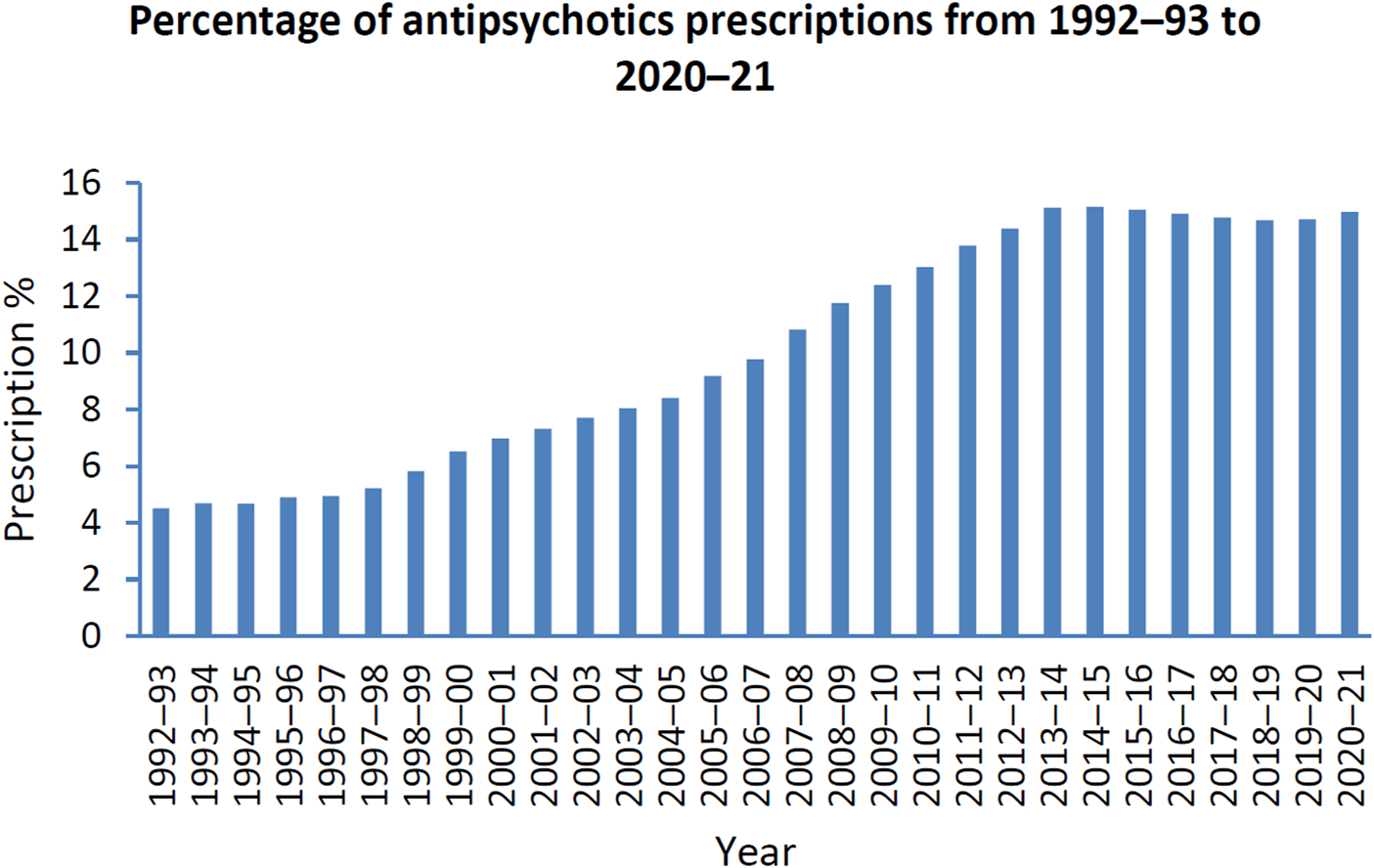 Percentage of patients prescribed antipsychotics from 1992–1993 to 2020–2021; Data adopted from mental health services in Australia: Mental health related prescriptions Australian Institute of Health and Welfare (Australian Institute of Health and Welfare, 2022).
