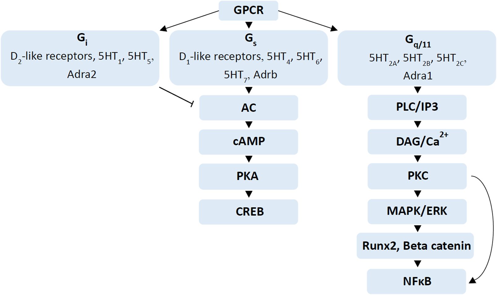 Signalling cascades regulated by dopamine, serotonin and adrenergic receptors. G-protein coupled receptor stimulation by different neurotransmitters such as dopamine, serotonin and adrenergic receptors regulate different signalling cascades. Activation of Gi receptors such as D2-like receptors, 5HT1, 5HT5 and Adra2 inhibit adenylate cyclase (AC), while activation of Gs receptors such as D1-like receptors, 5HT4, 5HT6, 5HT7 and Adrb stimulate AC to increase cAMP levels, which in turn activate the PKA/CREB pathway (Zhao et al., 2016; Ramaswamy et al., 2017; Wang et al., 2018; Martel and Gatti McArthur, 2020). Gq/11 receptors activate PLC-IP3 and DAG-PKC signalling pathways, which activate the mitogen-activated protein kinase (MAPK)/ERK signalling cascade (Gustafsson et al., 2006a; Dai et al., 2014; McCorvy and Roth, 2015). Activation of MAPK/ERK also stimulates Runx2 and beta-catenin in osteogenesis while activation of Protein kinase C (PKC) stimulates nuclear factor kappa-light-chain-enhancer of activated B cells (NFκB), important in osteoclast differentiation (Abu-Amer, 2013; Zhao et al., 2016; Kim et al., 2019).