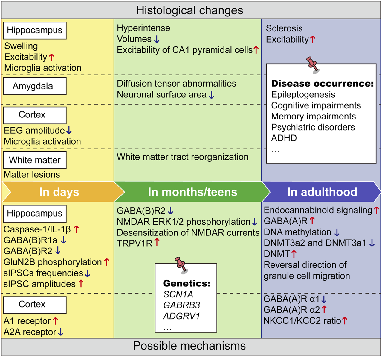 The neurodevelopmental changes after FSs and underlying mechanisms over time. The upper part summarizes the histological changes over time following FSs and the lower part summarizes the corresponding underlying mechanisms. Upward red arrows indicate increase or enhancement, and downward blue arrows indicate decrease, attenuation, or loss. The contents on the white notes indicate lesions or gene mutations that may span a long-time course throughout the developmental stage.