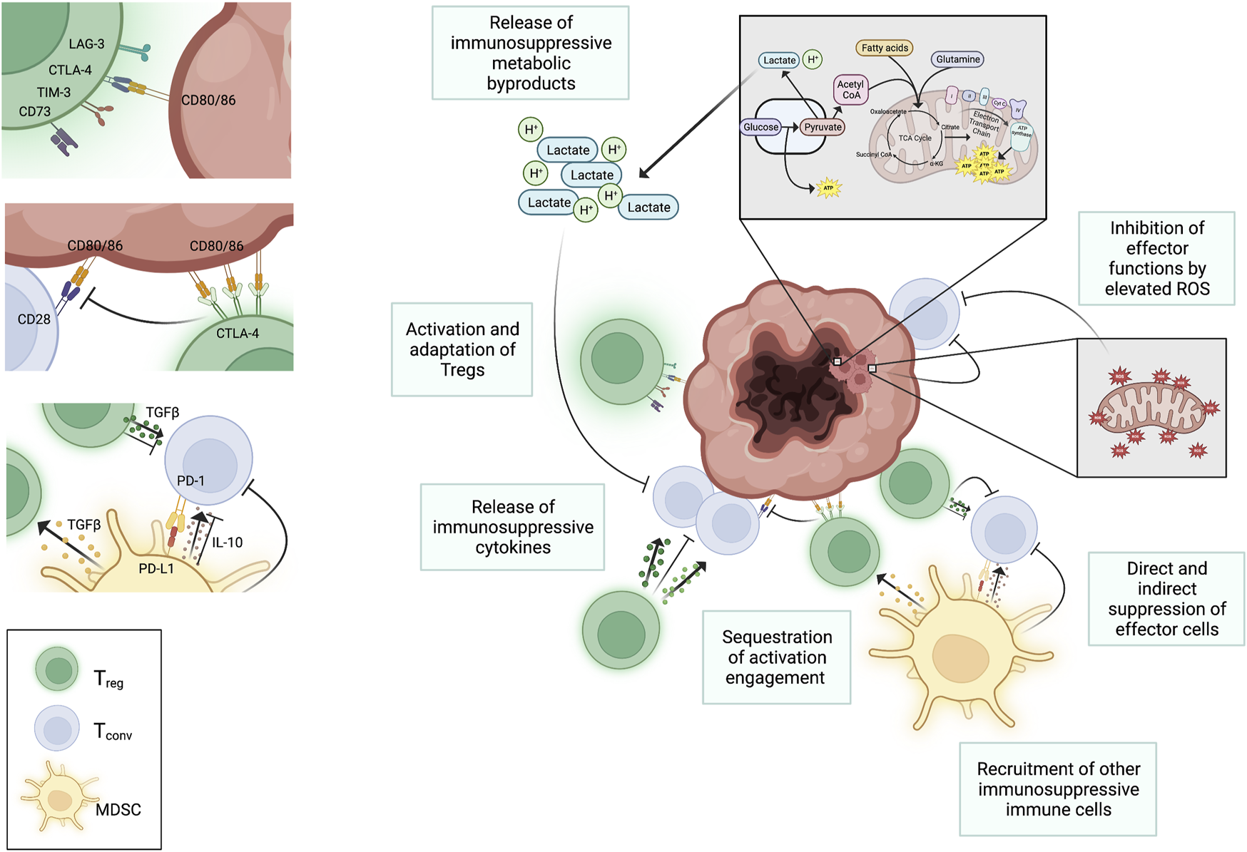 Negative regulation of T cell function in the TME. Several factors in the TME negatively impact T cell function. High metabolic activity of tumors metabolism and increased mitochondrial activity results in accumulation of harmful metabolic byproducts in the interstitial space that negatively impacts T cells in the TME. Regulatory immune cells, like T regs and myeloid derived suppressor cells (MDSCs), are recruited to the sites of tumors and suppress proliferation and function of conventional T cells through both the engagement of checkpoint inhibitors (e.g., PD-1 on conventional T cells) and through the release of suppressive cytokines (e.g., TGFβ, IL-10, and IL-35). These cytokines also serve to further activate T regs. Activated T regs upregulate CTLA-4, which selectively binds to CD80 and CD86 on APCs blocking interaction between CD80/86 and CD28 on conventional T cells. This hinders T cell activation. The binding of CTLA-4 to CD80 and CD86 can also initiate the endocytosis of these ligands further decreasing availability for binding to CD28 on conventional T cells. Despite the buildup of metabolic waste that suppress conventional T cells in the TME, regulatory immune cells are better able to tolerate the harsh conditions and can continue to extend their suppressive roles against the anti-tumor effector functions of conventional T cells. Created with Biorender.com.