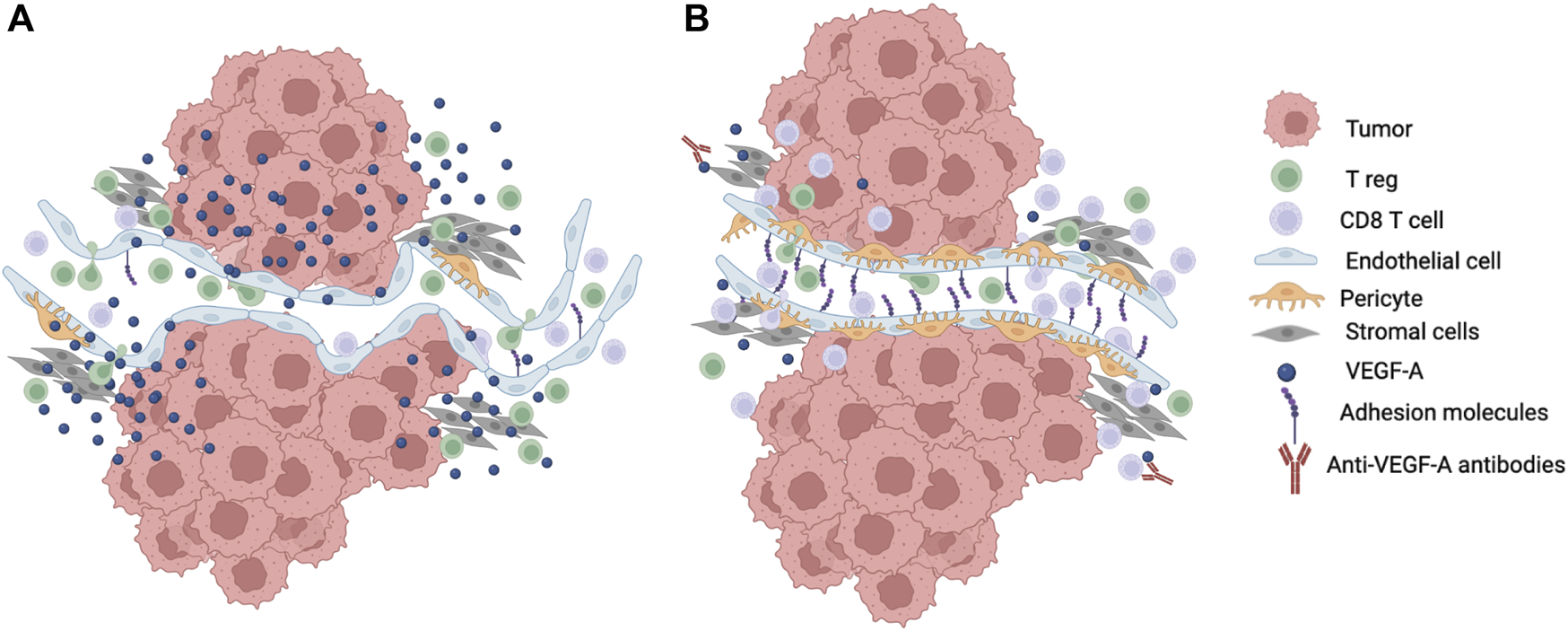 Modulation of T cell infiltration into the TME. (A) Growth and energetic demands of tumor cells creates a hypoxic TME that drive secretion of angiogenic factors such as VEGF-A into the microenvironment. This leads to neovascularization with new vessel formation that are immature, tortuous, easily compressed, and leaky with reduced pericytes and suboptimal surrounding basement membranes. The abnormal tumor vasculature contributes to the disruption of laminar flow and shear stress. Increased VEGF-A also leads to downregulation of adhesion molecules like ICAM-1 and VCAM-1 that are required for T cell adhesion and extravasation. Tumor cells may also preferentially secrete chemokines that attract T regs. These changes in the microenvironment lead to decreased effector T cell infiltration into the TME. (B) Reduction in the amount of VEGF-A in the TME such as through the blockade of VEGF-A using antibodies leads to normalization of the tumor vasculature with better perfusion and increased T cell adhesion to endothelial cells as well as less vascular compression and less mechanical stress that improve effector T cell infiltration into the TME. Created with Biorender.com.