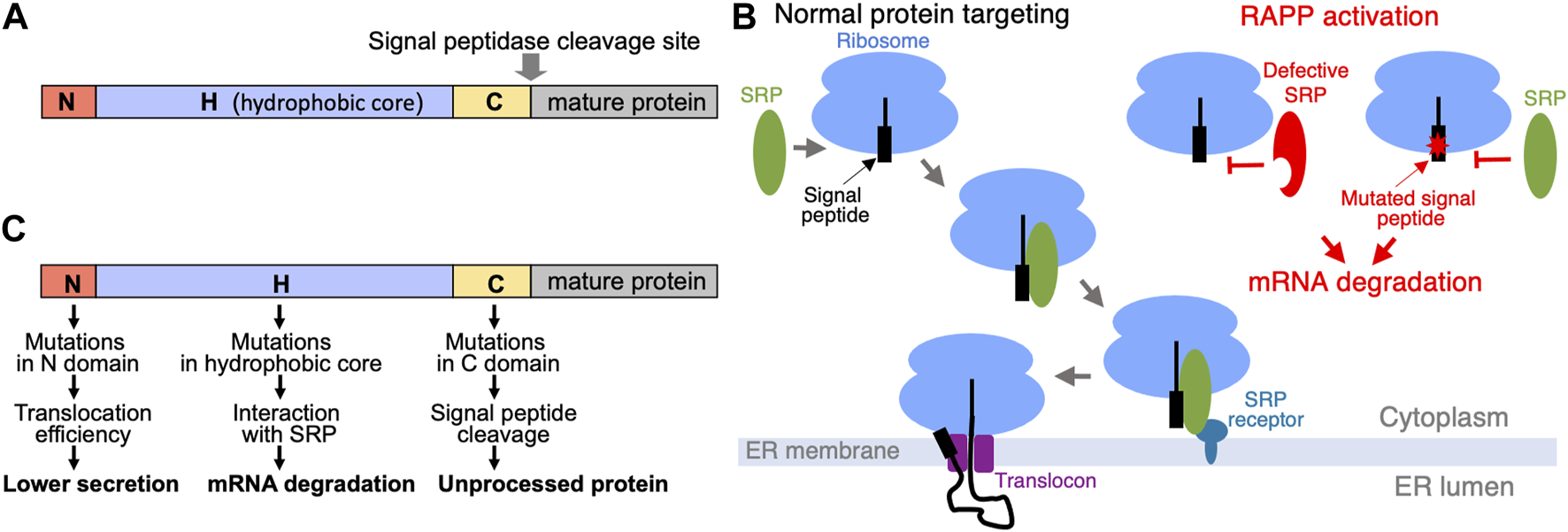 Signal peptides, protein targeting and its dysregulation. (A) Domain organization of signal peptides. (B) Scheme of SRP-dependent protein targeting in eukaryotes and Regulation of Aberrant Protein Production (RAPP) quality control on the ribosome. Under normal conditions SRP recognizes signal peptide and targets ribosomes to the SRP receptor in the ER membrane, and finally the secretory protein is translocated through the translocon to the ER lumen. However, when SRP is not able to recognize the signal peptide because of the mutations or because defects in the SRP itself, RAPP quality control is activated and the mRNAs are degraded. (C) Mutations in signal peptide domains affect different processes: mutations in the N domain affect efficiency of the protein translocation and secretion; mutations decreasing hydrophobicity of the H domain disrupt interaction with SRP, trigger RAPP protein quality control and lead to mRNA degradation of the mutated protein; mutations in the C domain may affect processing by a signal peptidase.
