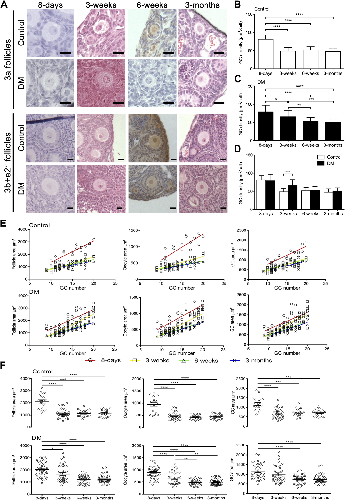Analysis of early follicles in Control and DM ovaries. (A) Representative images of primary follicles (3a, and 3b and early secondary; e2°) in Control and DM ovary sections at 8-day, 3-week, 6-week, and 3-month. Scale bar = 20 μm. Granulosa cell (GC) packing density of (B) Control and (C) DM follicles at 8-day, 3-week, 6-week and 3-month. (D) Comparison of GC packing density between Control and DM at the different ages. (E) The relationship between follicle, oocyte and GC area with GC number in 3a primary follicles in Control and DM at 8-day (open circles; Control n = 3 mice, n = 19 follicles, DM n = 3 mice, n = 38 follicles), 3-week (open squares; Control n = 3 mice, n = 37 follicles, DM n = 3 mice, n = 36 follicles), 6-week (open triangles; Control n = 3 mice, n = 23 follicles, DM n = 3 mice, n = 38 follicles) and 3-month (crosses; Control n = 3 mice, n = 22 follicles, DM n = 3 mice, n = 46 follicles). (F) Comparison of follicle, oocyte and GC area of primary 3a follicles within Control and within DM ovaries at the different ages. Results are expressed as mean ± SD. *p ≤ 0.05, **p ≤ 0.01, ***p ≤ 0.001, ****p ≤ 0.0001.