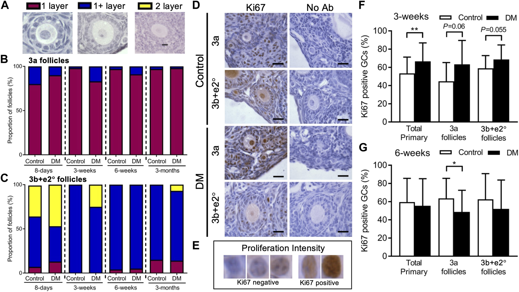 Since differences in area between Control and DM follicles existed at 3- and 6-week, and follicles from DM 3-week ovaries develop a second layer of GC earlier, we examined whether these changes were accompanied by changes in GC proliferation (Figure 2D). The proportion of Ki67 positive GCs per follicle were analysed in all primary follicles and for 3a and 3b + e2° follicles separately using the GC assessment scale (Figure 2E).