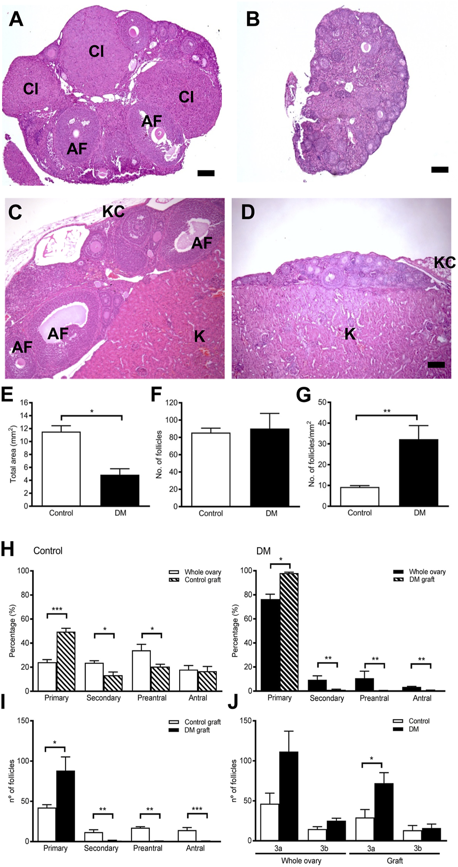 Ovarian morphology and follicle development in ovarian tissue graft from Control and DM mice. (A) Representative image of a Control 9-week ovary containing numerous follicles at different stages of development alongside corpora lutea. (B) Representative image of a DM 9-week ovary containing only primary follicles. (C) After 4 weeks of ovarian tissue transplantation to a wildtype immunocompatible host, Control grafted ovarian tissue had normal ovarian morphology containing all stages of follicle development whilst. (D) DM grafted ovarian tissue exhibited morphology comparable to a 9-week DM ovary. AF: antral follicle, Cl: corpus luteum, (K) kidney tissue, KC: kidney capsule. Bar scale represents 100 um. (E) Total area in the sections analysed of grafted ovarian tissue (Control n = 5 and DM n = 8). (F) Number of follicles counted in each ovarian graft by analysis of every 10th section. (G) Density of follicles per mm2 of grafted ovarian tissue analysed in Control and DM. (H) Proportion of follicles at each stage of development in Control and DM 9-week ovaries (Control n = 3, DM n = 3) and in graft tissue (Control n = 5, DM n = 8). (I) Comparison of the number of follicles at each stage of development in the Control and DM ovarian tissue graft. (J) Number of primary follicles Figure 3A, B: Control and DM whole ovary and ovarian tissue graft. Results are expressed as mean ± SEM. *p < 0.05, **p < 0.01, ***p < 0.001.