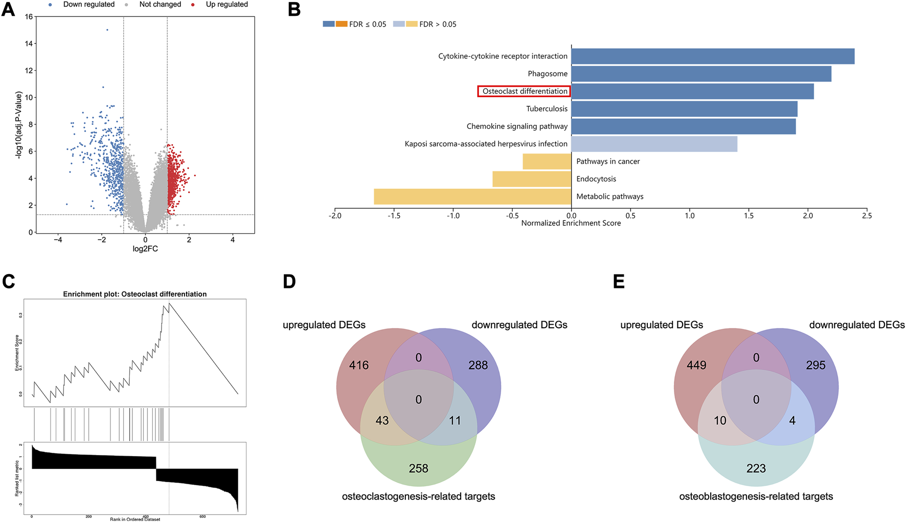 Bioinformatic analyses revealed osteoclastic genes quantitatively dominated in the pathogenesis of SIONFH compared to osteoblast genes. (A) Volcano map of the GSE123568, which consisting of 30 SIONFH patients and 10 non-SIONFH patients. The |logFC| > 1 and an adjusted p-value <0.05 were set as the threshold to screen differentially expressed genes (DEGs). (B–C) Gene Set Enrichment Analysis (GSEA) results of DEGs in GSE123568 using WebGestalt indicated that the osteoclast differentiation was significantly enriched. (D) Venn Diagram of intersection between DEGs and osteoclast-related targets. (E) Venn Diagram of intersection between DEGs and osteoblast-related targets.