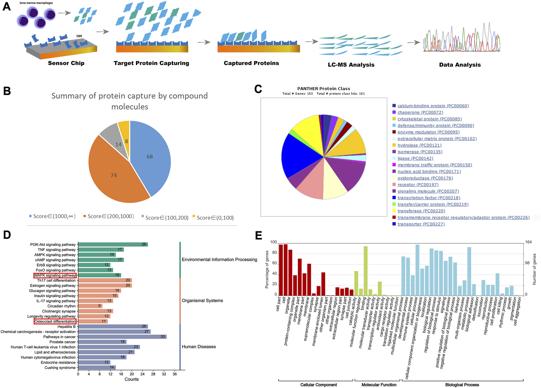 Proteomics detected the binding proteins of DBR in BMMs. (A) The diagrams of process and mechanism of the SPR, HPLC and TOF–MS. (B) The score of the target protein that DBR acts on BMMs and the proportion of different score segments. (C) The protein class hits of DBR targets. (D) The KEGG enrichment analysis of DBR targets. (E) The enrichment ratios of target proteins in biological process, cell composition and molecular function in biological function obtained by GO enrichment analysis.