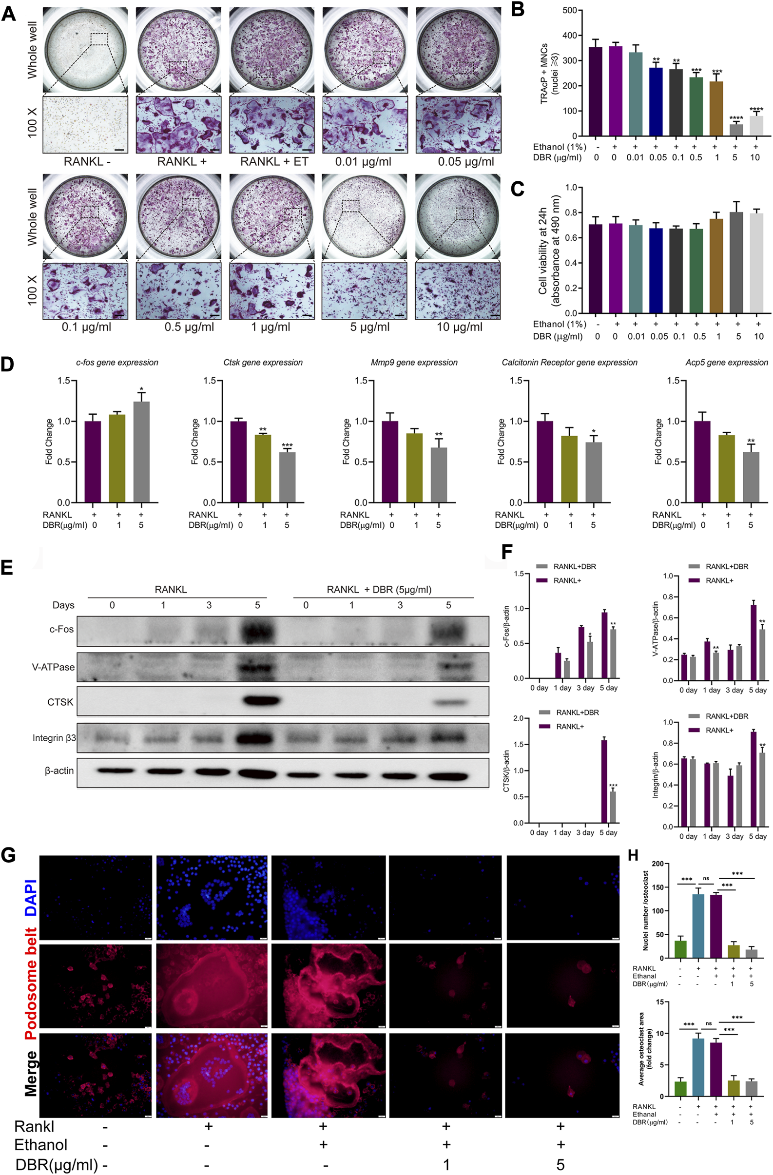 DBR attenuated RANKL-induced osteoclast differentiation and specific osteoclast-related gene expression. (A) Representative images showing RANKL-induced osteoclasts treated with DBR at indicated concentrations as examined by TRAcP staining. Scale bar = 200 μm. (B) Quantification of TRAcP positive, multinucleated cells (MNCs) in the osteoclast cultures after the treatment of DBR for 5 days. (C) MTS assay of the BMMs stimulated with different concentrations of DBR. (D) Real-time PCR was utilized to determine the expression levels of osteoclast-specific genes, c-fos, Ctsk, Mmp9, Calcitonin receptor and Acp5. (E) Representative images of c-Fos, Integrin β3, V-ATPase and CTSK expression in RANKL-treated osteoclasts after the addition of DBR. Protein expression is normalized to β-actin. (F) Quantitative analysis of c-Fos, Integrin β3, V-ATPase and CTSK normalized to β-actin. (G) Pseudopodia bands labeled with phalloidin (red) and nuclei labeled with DAPI (blue) after intervention with DBR. Scale bar = 20 μm. (H) Quantitative analysis of the area of the pseudopodia band and the number of osteoclast nuclei. All bar graphs are presented as mean ± SD (n = 3). (*p < 0.05, **p < 0.01, ***p < 0.001).