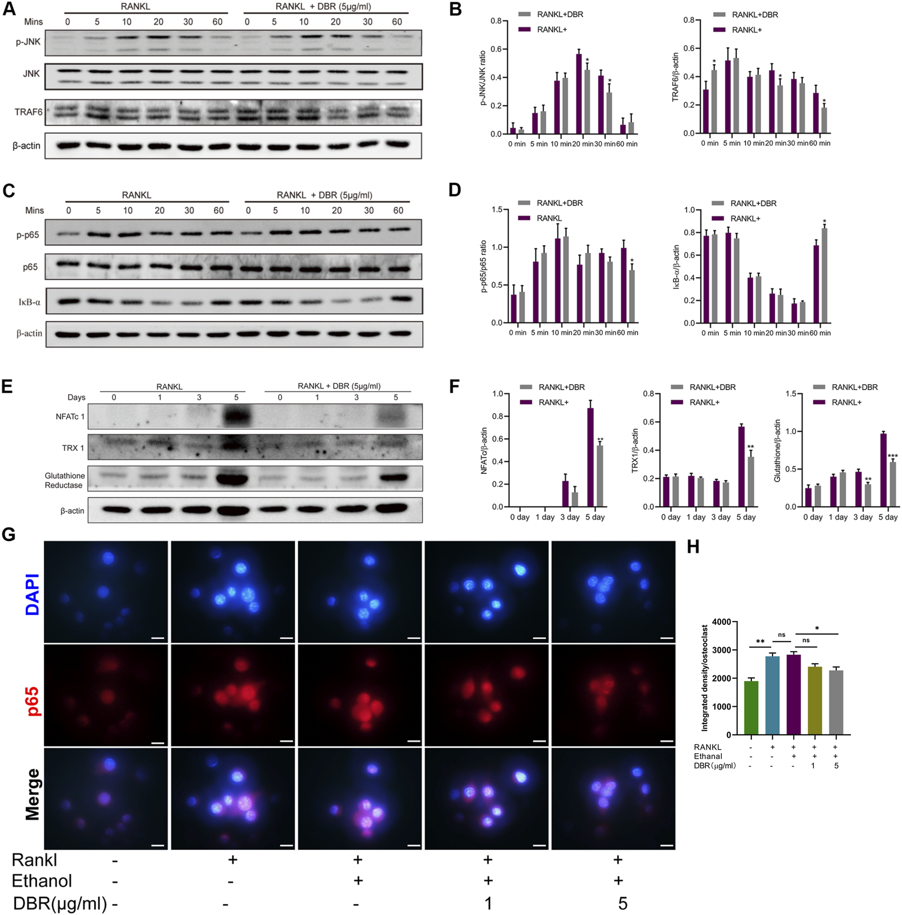 DBR regulated intracellular MAPK and ROS signaling in RANKL-induced osteoclasts. (A) Representative images of phosphorylation of JNK and TRAF6. (B) Quantitative analysis of phosphorylation of JNK and TRAF6 normalized to JNK and β-actin. (C) Representative images of P65 and IκB-α expression in RANKL-treated osteoclasts after the addition of DBR. Protein expression of IκB-α is normalized to β-actin. (D) Quantitative analysis of P65 and IκB-α normalized to P65 and β-actin. (E) Representative images of NFATc1, TRX1 and glutathione reductase expression. Bone marrow macrophages (BMMs) were pretreated with DBR prior to the stimulation with RANKL. Total protein was analyzed by Western blot at 1, 3, and 5 days. (F) Quantitative analysis of protein expression levels of NFATc1, TRX1, and glutathione reductase normalized to β-actin (n = 3). (G) Immunofluorescence staining and quantification (H) for nuclear localization of p65. Scale bar = 100 μm. All bar graphs are presented as mean ± SD (n = 3). (*p < 0.05, **p < 0.01, ***p < 0.001).