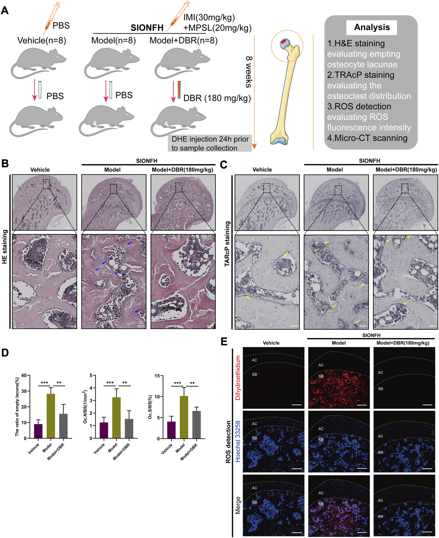 DBR ameliorated SIONFH rats by inhibiting ROS and osteoclast activity. (A) Schematic illustration of the establishment of rat ONFH model. All rats were randomly divided into three groups: vehicle group, model group, and model + DBR (180 mg/kg) group. (B) Hematoxylin and Eosin (HE) staining of decalcified paraffin-embedding sections showing the increased number of empty lacunae (green arrows) and adipose tissue area (asterisk) in the model group, while the number of empty lacunae was decreased in model + DBR group. (C) Tartrate-resistant acid phosphatase (TRAP) staining showing the osteoclasts (yellow arrows) were increased in the model group, but were decreased by DBR. (D) Quantitative analyses of the ratio of empty lacuna, N.OC/BS and Oc.S/BS, All bar graphs are presented as mean ± SD (n = 5). N.Oc/BS, osteoclast number/bone surface; Oc.S/BS, osteoclast surface/bone surface. (*p < 0.05, **p < 0.01, ***p < 0.001). (E) Cryosections of femoral heads showing ROS level, as probed by dihydroethidium (DHE), in the vehicle group, model group and model + DBR group. AC, articular cartilage (white dashed line area); SB, subchondral bone.