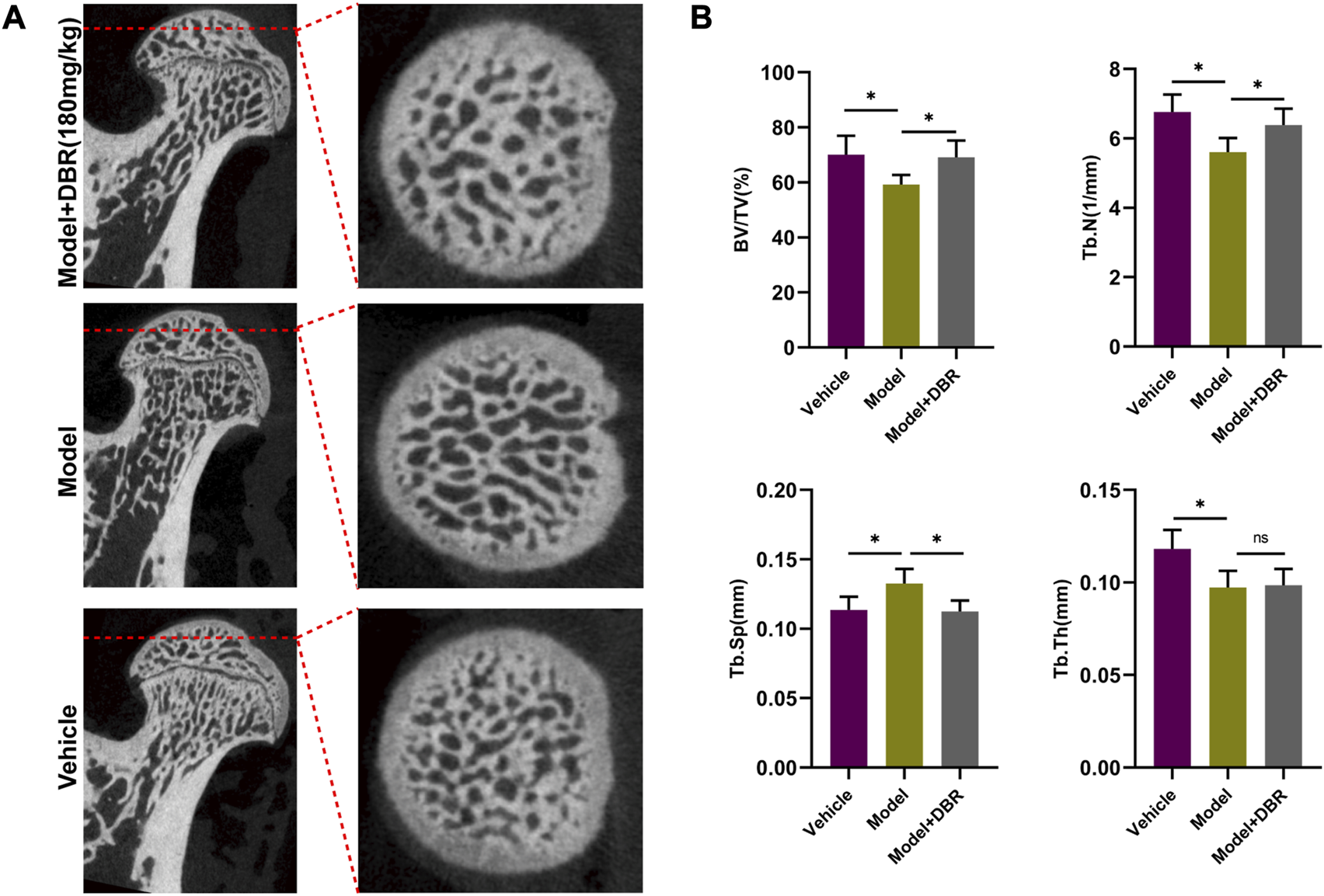 DBR ameliorated SIONFH rats by reducing bone loss. (A) Representative micro-CT scanning images of the femoral head. (B) Quantification of the bone microstructure parameters of the femoral head, including bone volume/tissue volume (BV/TV), trabecular number (Tb.N), trabecular thickness (Tb.Th) and trabecular separation (Tb.Sp). All bar graphs are presented as mean ± SD (n = 5). (*p < 0.05, **p < 0.01, ***p < 0.001).