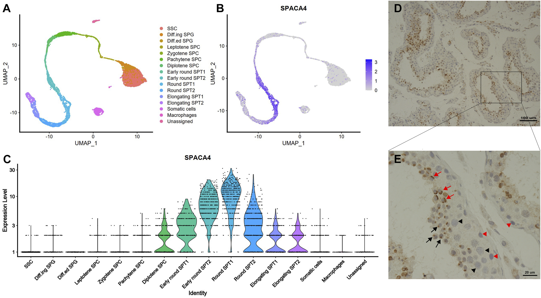 The expression profiles of SPACA4 in human testis. (A) Overview of the sequential stages of human spermatogenesis detected via single-cell RNA sequencing derived from published single-cell RNA-Seq data, represented in a UMAP1-UMAP2 (Uniform Manifold Approximation and Projection) plot; (B,C) Expression patterns and values of spaca4 during human spermatogenesis. (D,E) Expression patterns of SPACA4 during human spermatogenesis analyzed by immunohistochemistry. Black and red arrows indicate SPACA4 expression during the Golgi and cap phases of acrosomal morphogenesis, respectively. Arrow, spermatids; black triangle, primary spermatocytes; red triangle, spermatogonial stem cells. SSC, spermatogonial stem cells; SPG, spermatogonia; SPC, spermatocyte; SPT, spermatid.
