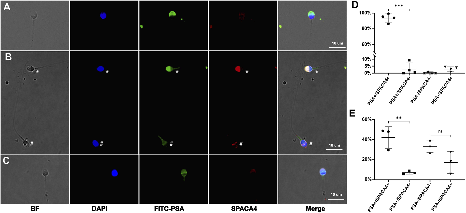 The expression profiles of human SPACA4 in ejaculated sperm. Immunofluorescence staining of acrosome (green) and SPACA4 (red) under non-permeabilizing (A) and permeabilizing conditions (B). SPACA4 was located in the whole acrosome region [(B), marked by an asterisk], but the fluorescence dimmed as the acrosome reaction proceeded (C). In acrosome-reacted sperm, the fluorescence of SPACA4 was confined to the equatorial segment [(B), marked by a pound]. The fluorescence patterns of FITC-PSA and SPACA4 in uncapacitated (D) and acrosome-reacted (E) sperm. **p < 0.01, ***p < 0.001.