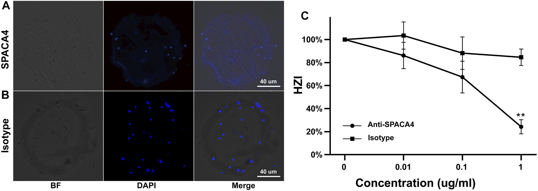 Inhibition of the binding of capacitated sperm to hemizona by anti-SPACA4 antibodies. Capacitated sperm were pretreated with anti-SPACA4 antibodies (A) or pre-immune rabbit immunoglobulin G [Isotype, (B)] before incubation with paired hemizona (n = 5). Antibodies against SPACA4 inhibited the number of sperm bound to hemizona (C). **p < 0.01.