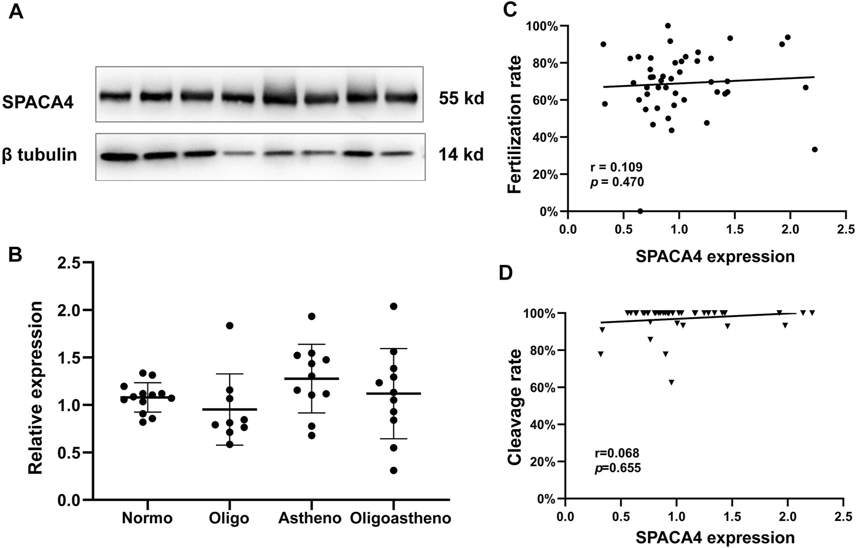 Expression of SPACA4 in ejaculated sperm and the relationship between SPACA4 expression and IVF outcomes. (A) The expression of sperm SPACA4 varied between individuals; (B) the expression of sperm SPACA4 between different semen samples was similar (p > 0.05); (C,D) the protein levels of sperm SPACA4 were not significantly correlated with fertilization or cleavage rates in IVF. Normo, Normozoospermia; Oligo, oligospermia; Astheno, asthenospermia; Oligoastheno, oligoasthenospermia.