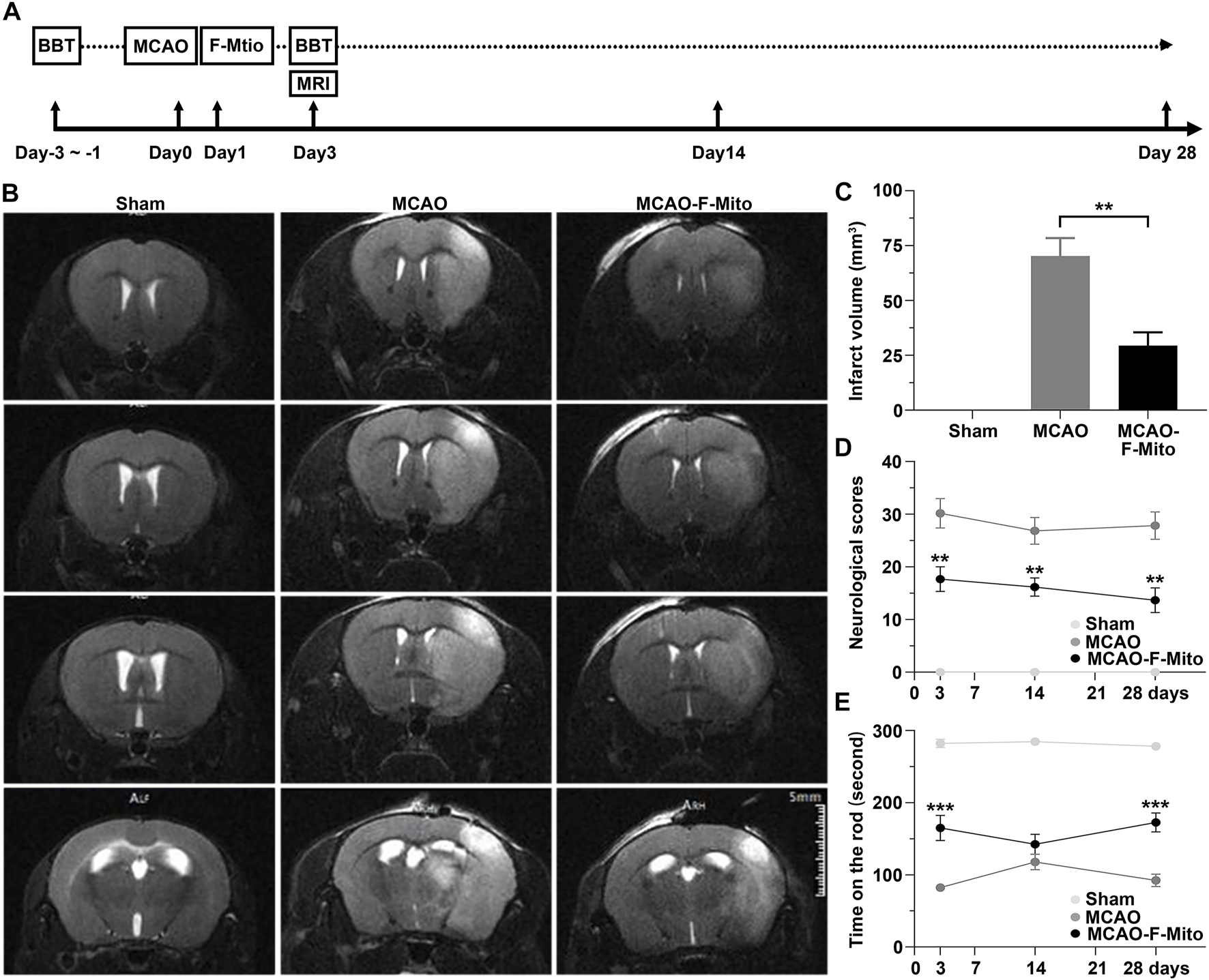 The free functional mitochondria isolated from UCMSCs transplantation decreased infarct volume and enhanced neurological functions in mice following an ischemic stroke. (A) The experimental design was schematically presented, where mice were subjected to transient intraluminal middle cerebral artery occlusion (MCAO) and randomly assigned to receive either saline (MCAO group) or F-Mito isolated from UCMSCs (MCAO-F-Mito group) in the lesion, starting 24 h after reperfusion. The sham group was not subjected to MCAO. The number of animals evaluated for each group (n = 6) and the time point of animal sacrifice on day 28 were provided. BBT means Behavioral Battery test including Neurological scoring and Rota rod test. (B) Brain MRI images of mice on day 3 post-stroke were shown. (C) Infarct volume analysis using MRI showed significant reduction in the MCAO-F-Mito group compared to the MCAO group. (D) The neurological scores of the experimental mice also demonstrated significant improvement in the MCAO-F-Mito group compared to the MCAO group, as did the results of the Rota rod experiment (E). *p < 0.05, **p < 0.01, ***p < 0.001, Student’s t-test. Standard error of the mean (SEM) was reported for each group.