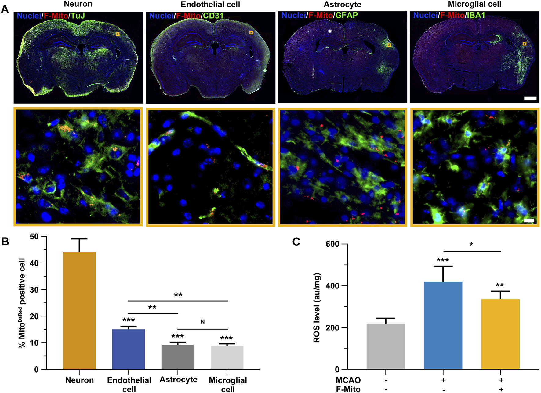 The uptake of F-Mito by neurons, endothelial cells, astrocytes and microglial cells in brain following an ischemia stroke. (A) The Fluorescent images demonstrated the internalization of F-Mito into cells within the lesion of the injection area. Scale bar for whole brain: 1,000 μm. Scale bar for magnification images: 10 μm. (B) The proportion of cells with DsRed-labeled mitochondria in vivo was represented, indicating statistically significant differences in comparisons made between the neuron group and other cell types, as well as between two different samples under a given line. The level of significance was denoted by *p < 0.05, **p < 0.01, and ***p < 0.001, as determined by One-way ANOVA with Bonferroni correction. The data were presented as means ± standard deviation (s.d.), and the study was conducted on six animals in the MCAO-F-Mito group. (C) The ROS levels of brain tissues 3 days after MCAO. The level of significance was denoted by *p < 0.05, **p < 0.01, and ***p < 0.001, as determined by One-way ANOVA with Bonferroni correction. The data were presented as means ± standard deviation (s.d.), and the study was conducted on six animals in each group.