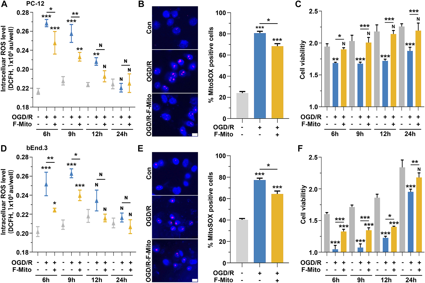 The treatment of the F-Mito reduced intracellular ROS and restored cell viability after OGD/R. The study was performed on PC-12 and bEnd.3 cells, and the results were reported for a period of 24 h after OGD/R. The treatment with F-Mito led to a restoration of cell viability and a reduction in intracellular ROS levels. (A) The intracellular ROS levels of PC-12 cells over time after OGD/R. (B) Mitochondrial ROS analysis with MitoSOX in PC-12 cells at 9 h after OGD/R. Fluorescent image of MitoSOX staining (magenta, MitoSOX; blue, WGA) and the proportion of MitoSOX-positive cells were shown. WGA was Wheat Germ Agglutinin to label cell for visualization. Scale bars: 10 μm. (C) The cell viability of PC-12 cells over time after OGD/R. (D) The intracellular ROS levels of bEnd.3 cells over time after OGD/R. (E) Mitochondrial ROS analysis with MitoSOX in bEnd.3 cells at 9 h after OGD/R. Scale bars: 10 μm. (F) The cell viability of bEnd.3 cells over time after OGD/R. In both cases, F-Mito treatment led to a significant decrease in intracellular ROS levels. Statistical analysis was conducted using One-way ANOVA with Bonferroni correction, and significance was considered when samples were compared to the control group at their respective time points (*p < 0.05, **p < 0.01, ***p < 0.001). The data were presented as means ± s.d., n = 3 independent experiments in (A,C,D,F), and n > 100 cells from three independent experiments in (B,E).