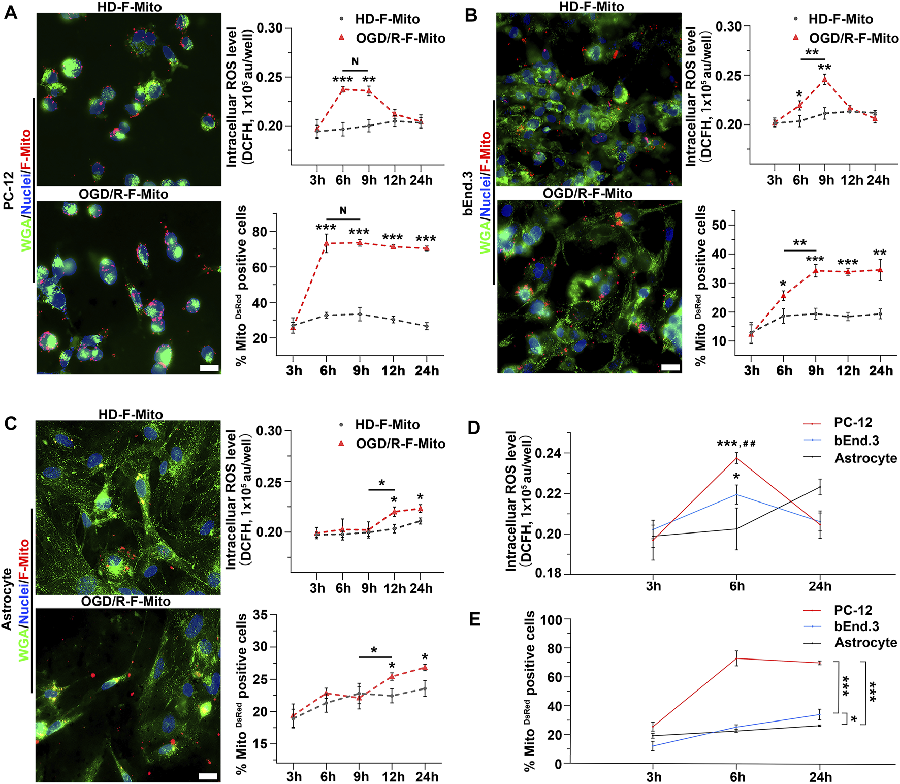 The positive dose-dependent relationship between intracellular ROS production and the uptake of F-Mito in different cell types within 24 h post OGD/R. (A) PC-12 cells were cultured under normal conditions and treated with F-Mito (HD-F-Mito) or subjected to OGD/R and co-cultured with F-Mito (OGD/R-F-Mito). The uptake of F-Mito by PC-12 at 6 h were shown. The intracellular ROS production within 24 h and a proportion of PC-12 cells with F-Mito over time were also depicted. WGA was used to label the cell membrane. Scale bars: 20 μm. Statistical analysis was conducted using Student’s t-test and significance was determined when sample in OGD/R-F-Mito was compared to that in HD-F-Mito group at different time point or in comparisons between two different samples under a given line (*p < 0.05, **p < 0.01, ***p < 0.001). The data were presented as means ± standard deviation (s.d.), n = 3 independent experiments in ROS detection, and n > 100 cells from three independent experiments in the analyses of the MitoDsRed positive cell ratio. (B) The uptake of F-Mito by bEnd.3 cells at 6 h were shown, and the intracellular ROS production within 24 h, along with the proportion of bEnd.3 cells with F-Mito over time were depicted. (C) The uptake of F-Mito by astrocytes at 6 h were shown, and the intracellular ROS production within 24 h, along with the proportion of astrocytes with F-Mito over time were depicted. (D) ROS levels in PC-12, bEnd.3, and astrocytes at 3 h, 6 h, and 24 h post OGD/R were compared. Significance was determined when samples were compared to astrocytes (*) or to bEnd.3 (#). The statistical analyses were performed using one-way ANOVA with Bonferroni correction, and the significance levels were set at *p < 0.05, **p < 0.01, and ***p < 0.001 or #p < 0.05, ##p < 0.01, ###p < 0.001. The data were presented as means ± s.d. and n = 3 independent experiments. (E) The proportion of F-Mito internalized cells in PC-12, bEnd.3, and astrocytes at 3 h, 6 h, and 24 h was compared. The data were obtained from more than 100 cells across three independent experiments.