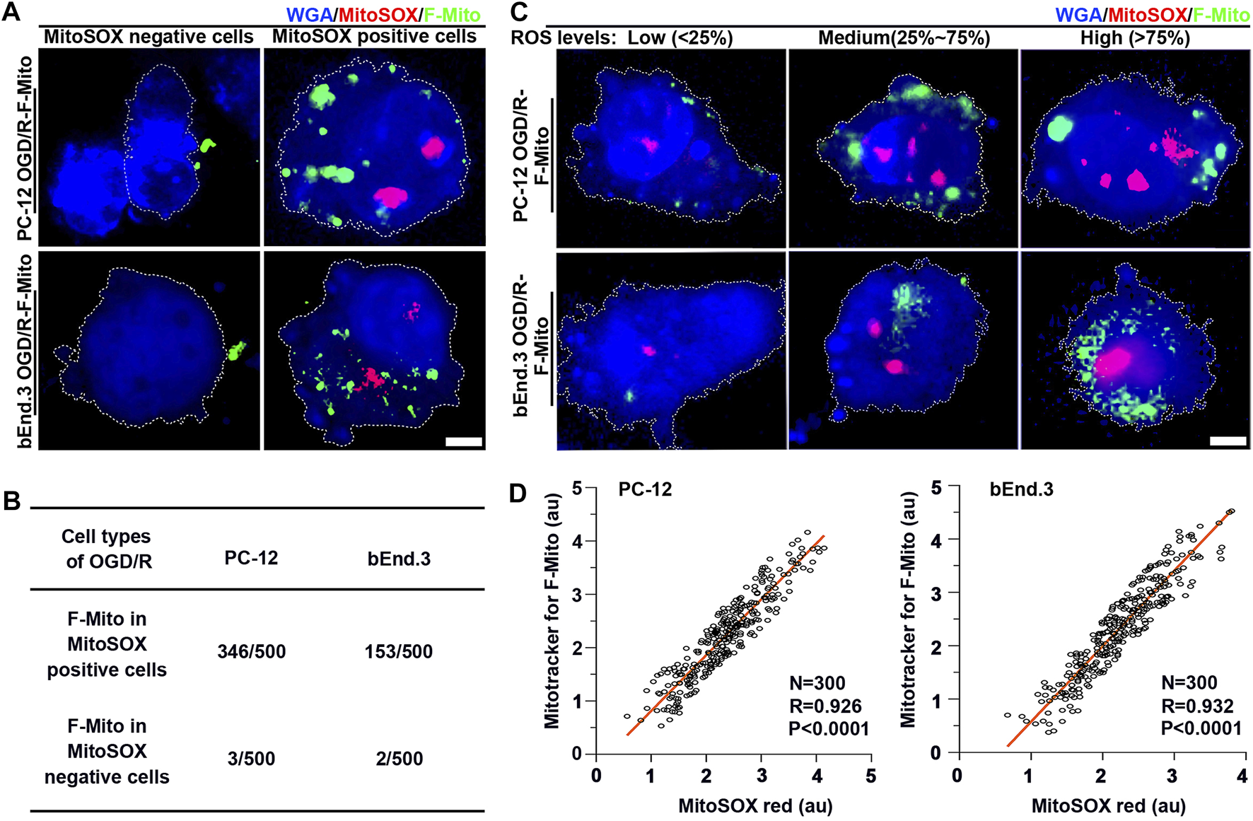 The F-Mito internalization correlated with ROS generation at the single cell level. Specifically, the results showed that cells with lower ROS levels exhibited decreased uptake of F-Mito. (A) Fluorescent images of PC-12 and bEnd.3 cells with and without F-Mito, respectively, after 9 h of OGD/R, and when cells were MitoSOX red positive or negative. The F-Mito were labeled with Mitotracker green, and cells were stained with WGA blue for visualization. Scale bars: 5 μm. (B) The uptake proportion of F-Mito in MitoSOX positive and negative cells at 9 h post OGD/R. 500 cells in each group were randomly selected in a uniform manner. (C) Representative fluorescent images of F-Mito uptake under different ROS levels at 6 h, as related to the boxplots presented in Supplementary Figures S16A, B, respectively. ROS were stained with MitoSOX red, F-Mito were labeled with Mitotracker green, and cells were stained with WGA blue for visualization. Scale bars: 5 μm. (D) A linear correlation between the internalized F-Mito level and ROS levels in OGD/R-stressed PC-12 and bEnd.3 cells at 6 h. Each data point represented a single cell, and the entire plot was based on measurements of 300 cells expressing MitoSOX selected in a uniform random manner. Pearson’s correlation coefficient (R) was reported, and mean gray value was presented as logs base e.