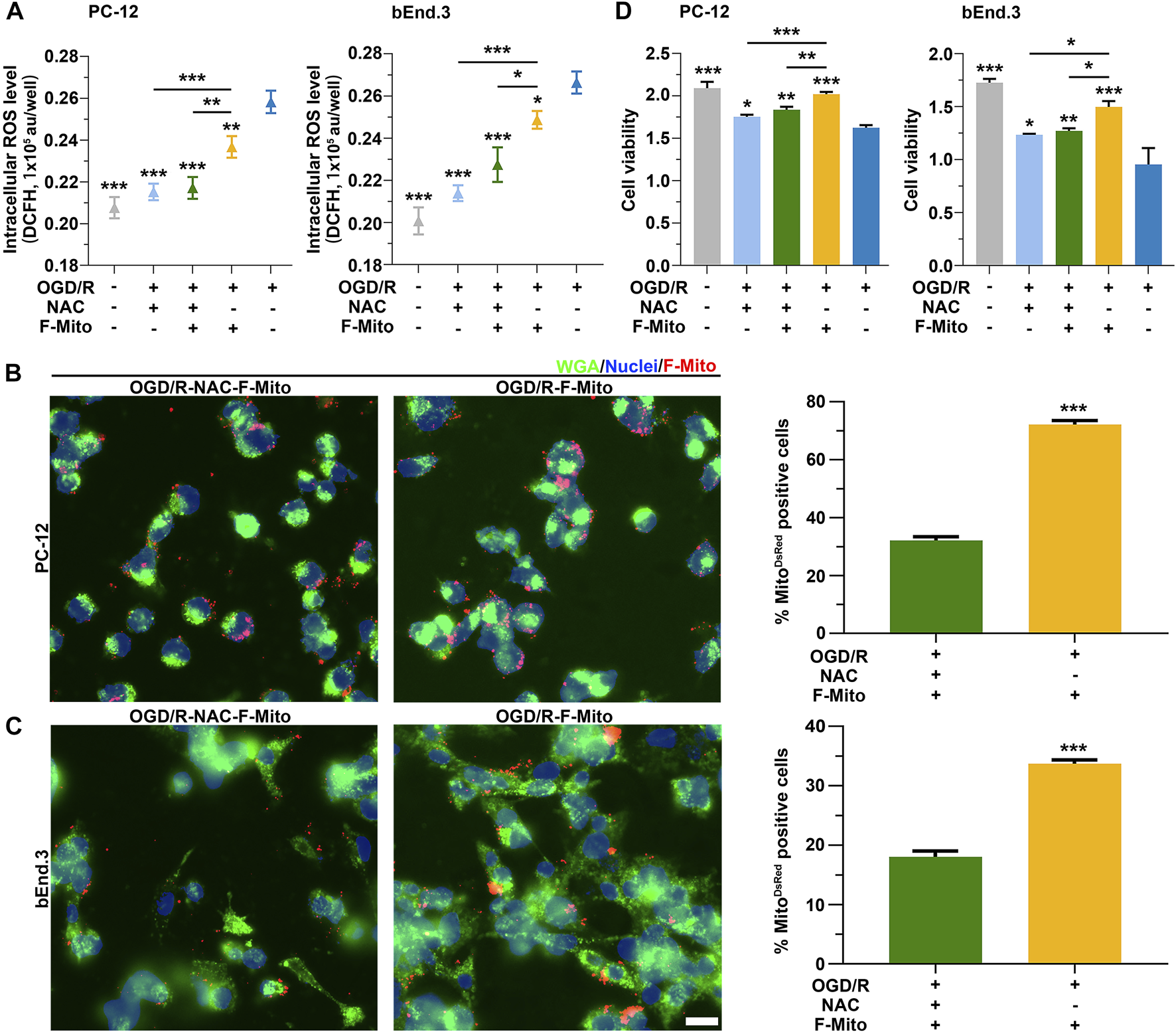 To validate the requirement of ROS for the internalization of F-Mito, we administered a ROS inhibitor, acetylcysteine (NAC), to cells undergoing OGD/R. As anticipated, ROS levels in PC-12 or bEnd.3 cells challenged with OGD/R were diminished upon treatment with NAC alone or in combination with F-Mito at 6 h (Supplementary Figure S17A) and at 9 h (Figure 6A). This decrease in ROS levels led to a reduction in the uptake proportion of F-Mito in NAC-treated cells relative to cells treated with F-Mito alone after OGD/R (Supplementary Figures S17B, C and Figures 6B, C), indicating the indispensability of ROS generation for the entry of free functional mitochondria. While the viability of stressed cells was restored upon NAC or F-Mito treatment, F-Mito alone-treated cells exhibited more remarkable survival than NAC alone-treated cells (Supplementary Figure S17D and Figure 6D) in PC-12 and bEnd.3. Similarly, ROS levels in neurons after OGD/R were decreased upon treatment with NAC alone or in combination with F-Mito at 6 h (Supplementary Figure S18) and led to a reduction in the uptake of F-Mito in NAC-treated neurons relative to that treated with F-Mito alone after OGD/R. The flow cytometry analysis also showed the reduction of F-Mito internalization when PC-12, bEnd.3 and neurons were treated with NAC at 9 h after OGD/R (Supplementary Figure S19).