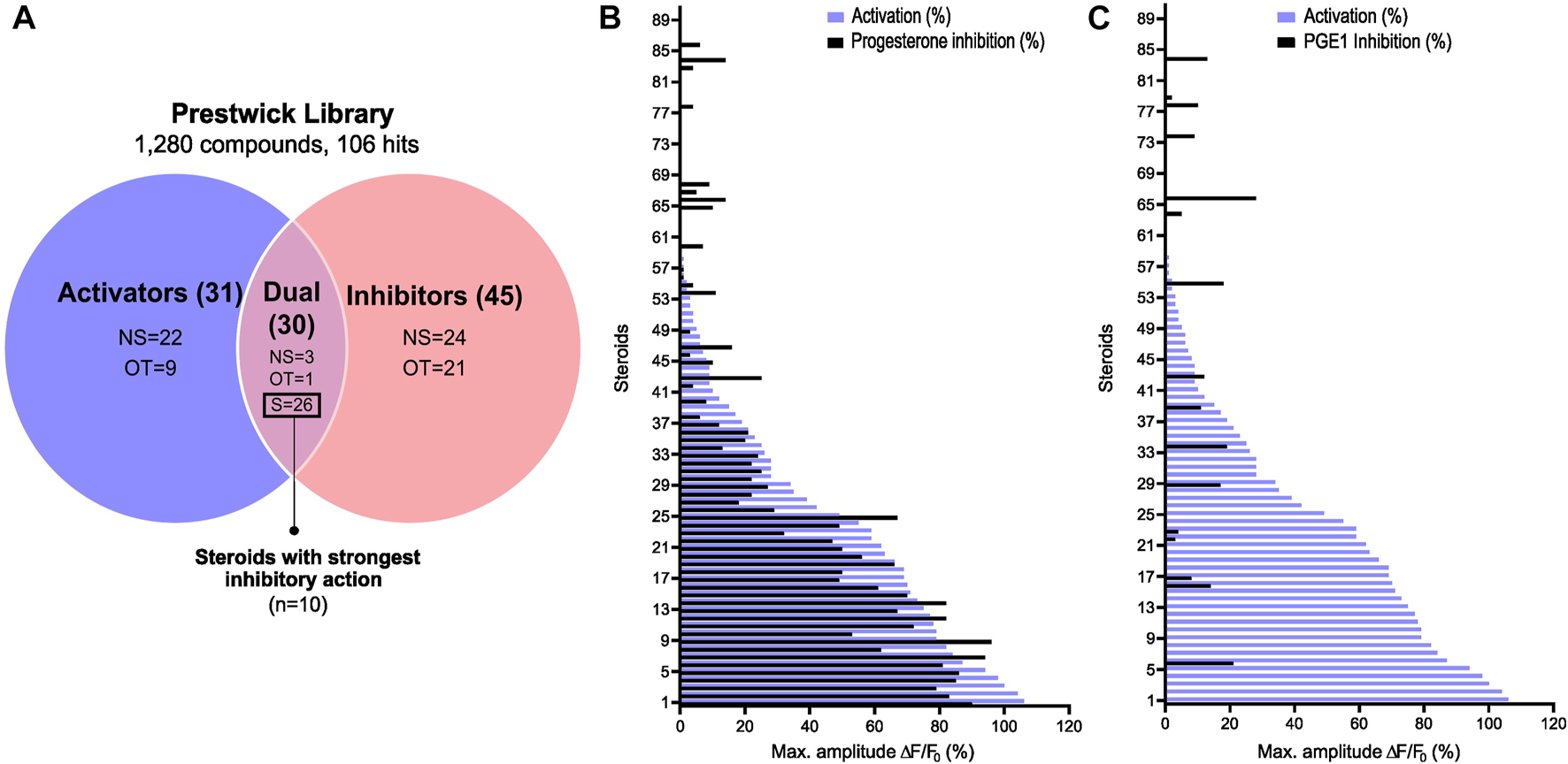 Steroid screening results and steroid selection workflow. (A) Venn diagram showing the selection of steroids. A total of 10 steroids with the most potent activating and P4-antagonizing activity were selected. NS: non-steroids; S: steroids; OT: off-targets. Graphical representation of the 90 steroids for their ability to increase the [Ca2+]i and inhibit in (B) the P4- and in (C) the PGE1-induced Ca2+ response. Data are expressed as the mean percentage of maximal amplitude ∆F/F0, triggered by each steroid at 10 µM and normalized to P4 response at 2 μM, before (activation, purple) or after the addition of P4 or PGE1 (inhibition in black).