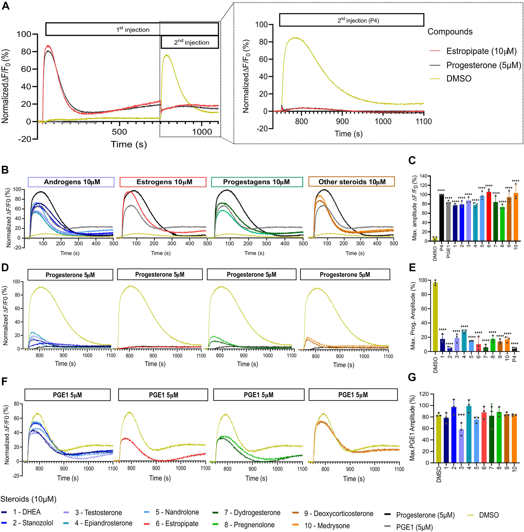 Representative curves of [Ca2+]i in human sperm cells induced by diverse steroids. (A) Representative curves of Ca2+ influx before and after the first addition of steroids alone (10 µM), buffer (DMSO 0.5%) or positive control (P4 or PGE1 - 5 µM) and a second addition to assess the impact of steroids on the P4 or PGE1 response. (B) Representative Ca2+ signals evoked by each of the 10 steroids at 10 µM (P4 and PGE1 at 5 µM were used as corresponding positive controls). (C) Bar plots representing the maximum amplitude of the increase in [Ca2+]i shown in B normalized to DMSO (n = 3). (D) Representative Ca2+ signals evoked by P4 (5 µM) after 12 min incubation of each of the 10 steroids. (E) Bar plot showing the maximum amplitude evoked by P4 in D normalized to DMSO (n = 3). (F) Representative Ca2+ signals evoked by PGE1 (5 µM) after 12 min incubation of each of the 10 steroids. (G) Bar plot showing the maximum amplitude evoked by PGE1 in F normalized to DMSO (n = 3). p(***) <0.001; p(****) <0.0001.