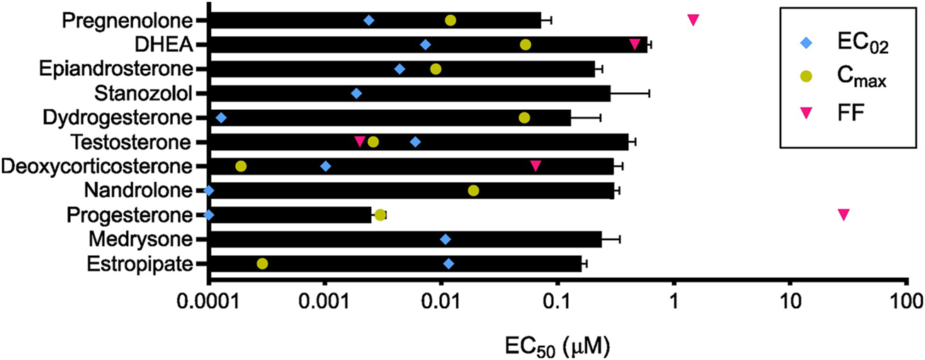 Steroids and their pharmacological concentrations. Calculated in vitro half maximal effective concentration (EC50, black) compared with reported maximum serum concentration (Cmax, yellow), average concentration in follicular fluid (FF, pink), and calculated minimum effective concentration (EC02, blue) (n = 3). Cmax was not found to be reported in the literature for medrysone and stanozolol as well as the FF concentration for epiandrosterone, stanozolol, dydrogesterone, nandrolone, medrysone, and estropipate.