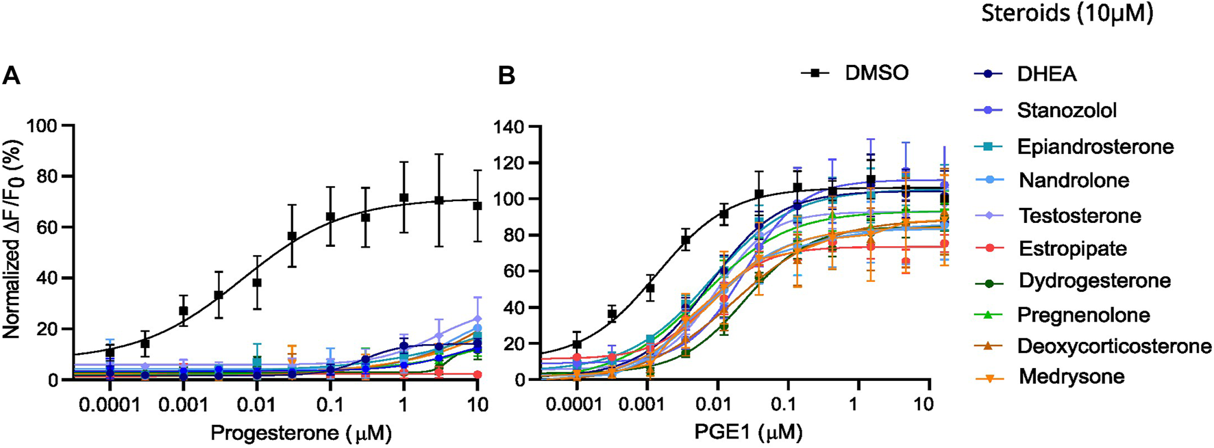 Desensitization experiments with increasing doses of P4 and PGE1 in the presence of a fixed dose of steroids. Dose-response curves of (A) the P4-induced and (B) the PGE1-induced Ca2+ response in the absence (DMSO) and presence of steroids at 10 µM. Data are presented as the mean of 3 independent experiments with error bars representing the standard deviation (SD).