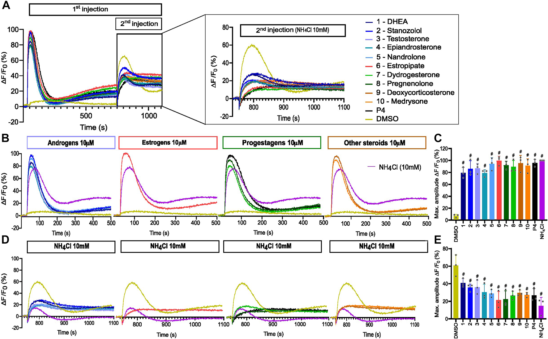Alkaline-evoked [Ca2+]i signals in the presence of steroids. (A) Representative curves of Ca2+ influx before and after the first addition of steroids alone (10 µM), buffer (DMSO 0.5%), or positive control NH4Cl (10 mM) and a second addition to assess the impact of steroids on the NH4Cl-induced response. (B) Representative curves of Ca2+ signals induced by steroids at 10 µM alone and positive control NH4Cl at 10 mM. (C) Bar plots representing the maximum amplitude of Ca2+ signals in B (n = 3). (D) Ca2+ influx evoked by NH4Cl (10 mM) after 12 min incubation of spermatozoa with steroids at 10 µM. (E) Bar plot of maximum amplitude of Ca2+ signals in D (n = 3), p(#) <0.0001.
