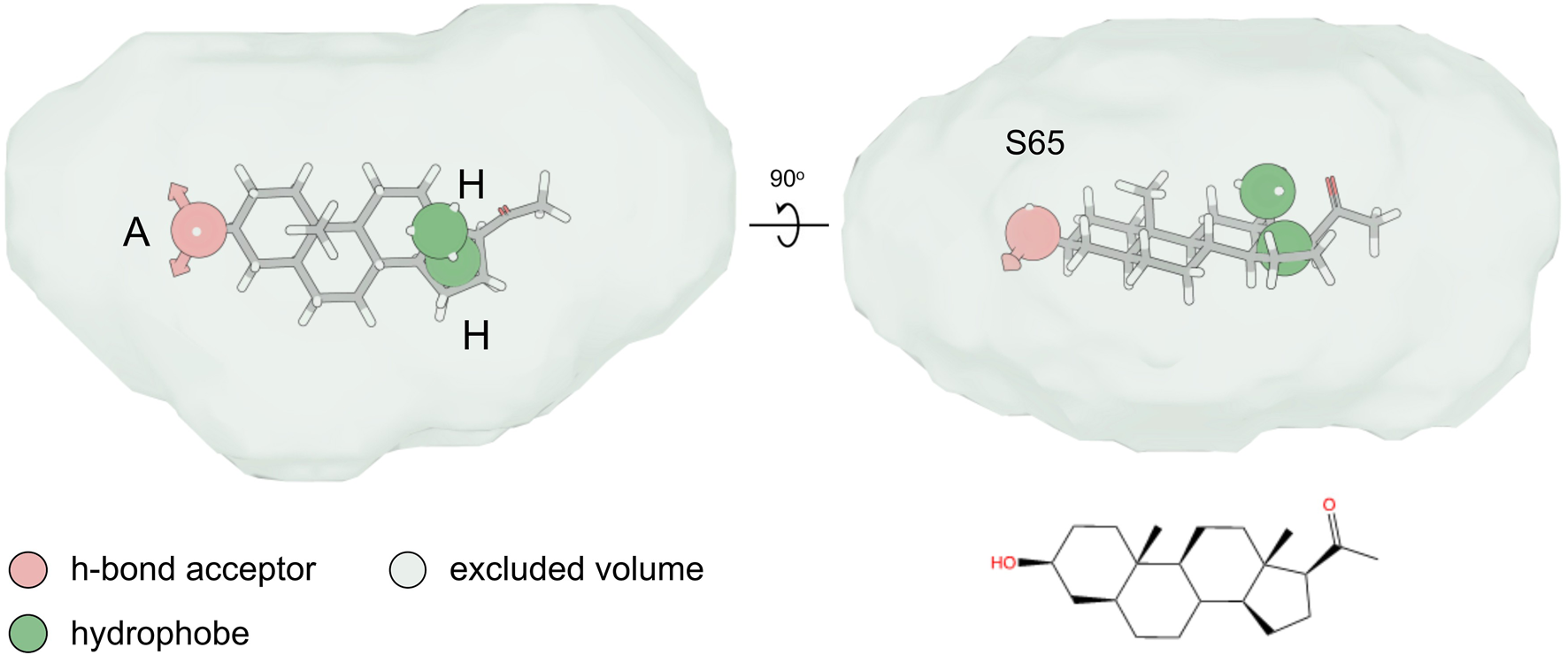 Pharmacophore hypothesis. Top and side view of the fitting of compound S65 into the pharmacophore hypothesis depicting the minimum pharmacophore features that a ligand needs to satisfy for it to interact non-covalently with its receptor. The hydrogen-bond acceptor (“A”) and hydrophobe (“H”) pharmacophore features are shown as spheres, while the excluded volume that was considered based on the shape of the agonist compounds is shown as a surface.