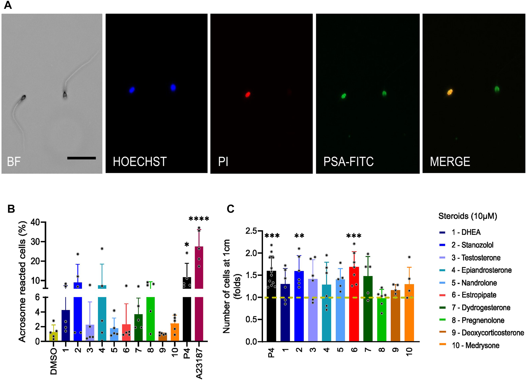 Sperm acrosome reaction and penetration in viscous media induced by steroids. (A) Images of fluorescently labeled spermatozoa obtained by bright field (BF) and fluorescence microscopy. Sperm were incubated for 30 min with Pisum sativum agglutinin-fluorescein isothiocyanate (PSA-FITC), Hoechst 33342 and propidium iodide (PI). Merge indicates the overlap of fluorescence images between PSA-FITC and PI-labeled spermatozoa. Scale bar = 50 µm. (B) Percentage (±SD) of live acrosome-reacted sperm in the presence of tested steroids (10 µM), P4 (10 µM), or ionophore A23187 (2 µM) used as positive controls, normalized to DMSO (n = 5). (C) The number of sperm cells that were able to penetrate a glass capillary tube filled with 1% methylcellulose was assessed after incubation of sperm with steroids (10 µM), or P4 (5 µM) or DMSO for 1 h. The number of cells is normalized to DMSO (shown in dashed mustard line) and results are presented in fold change. Stanozolol and estropipate significantly increased the number of sperm cells that can penetrate in viscous medium (n > 5). p(*) < 0.05; p(**) <0.01; p(***) <0.001; p(****) <0.0001.